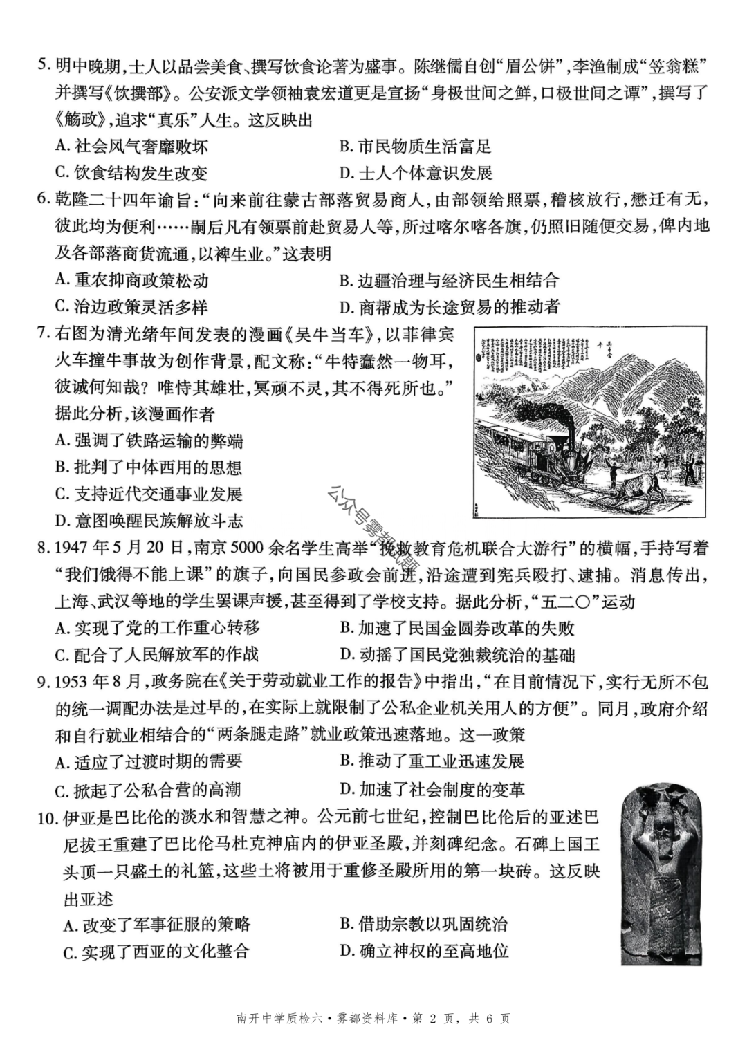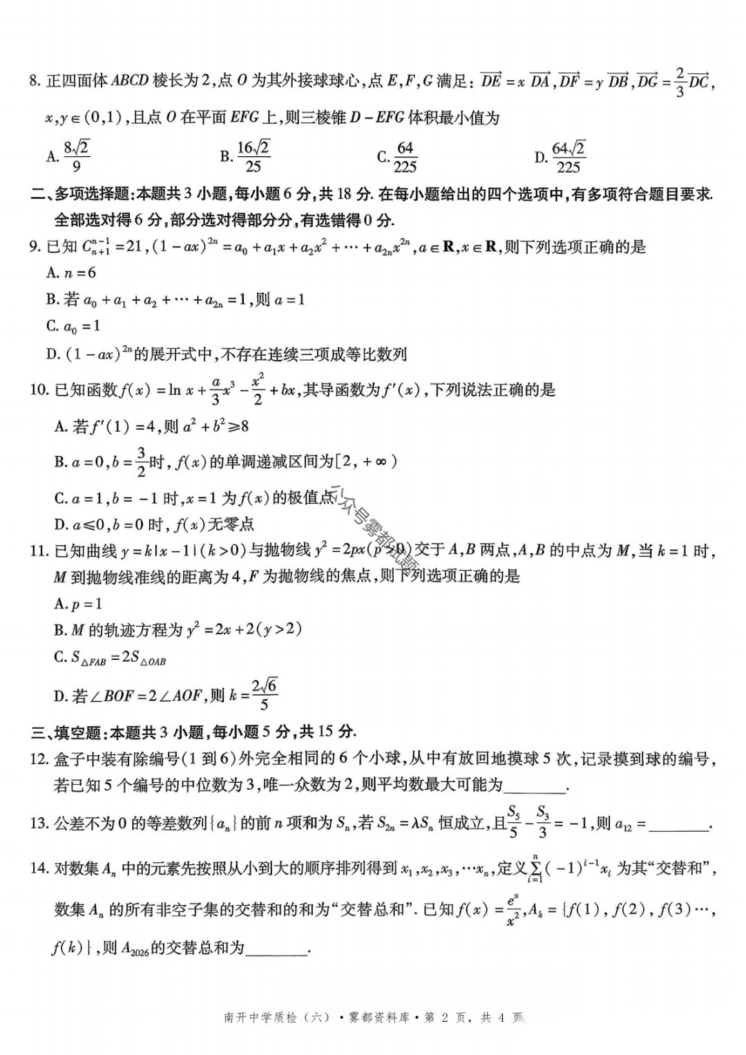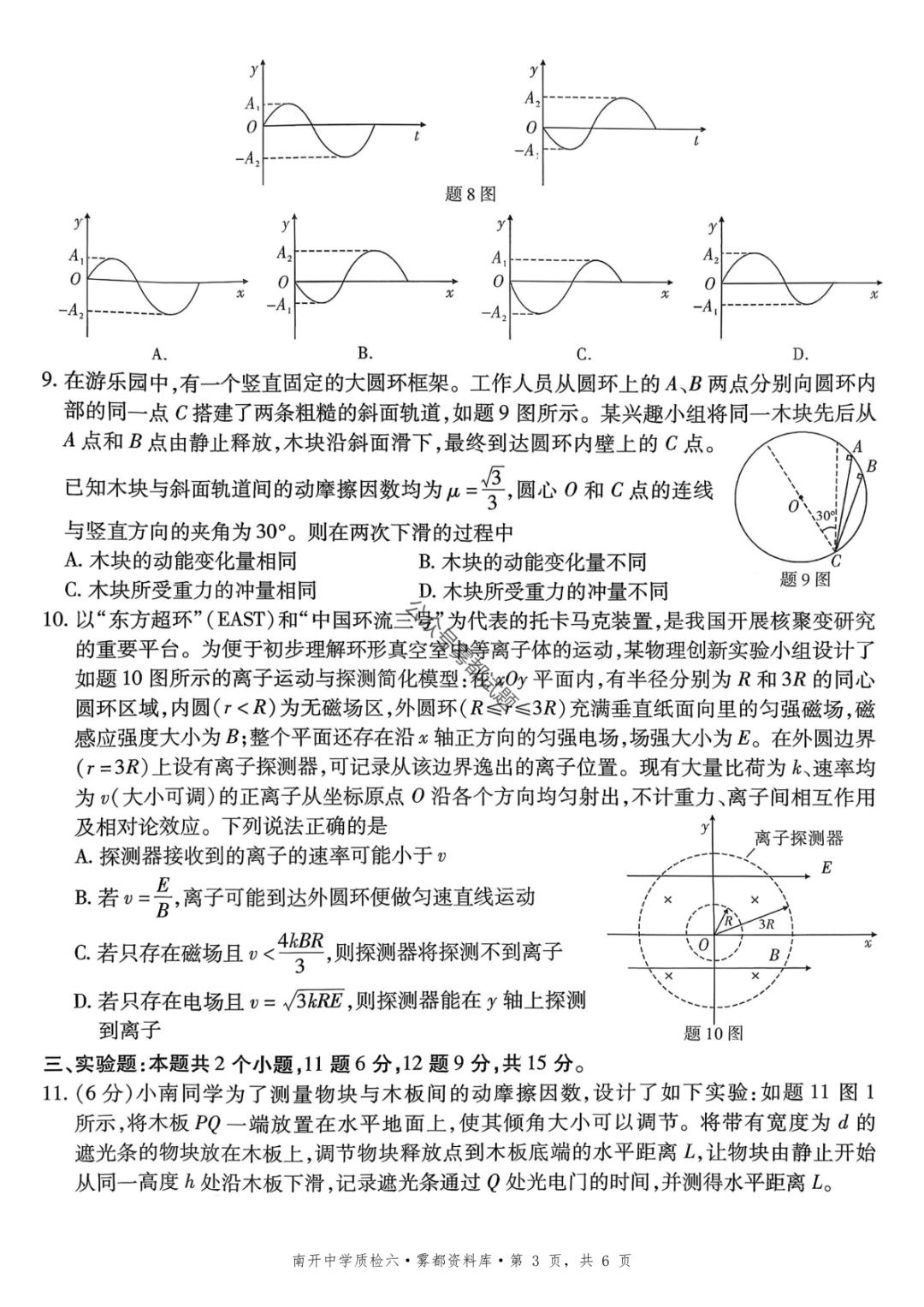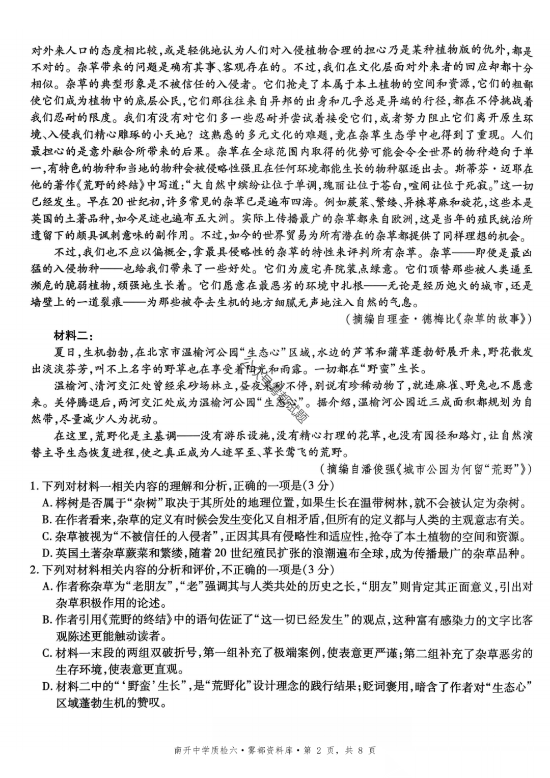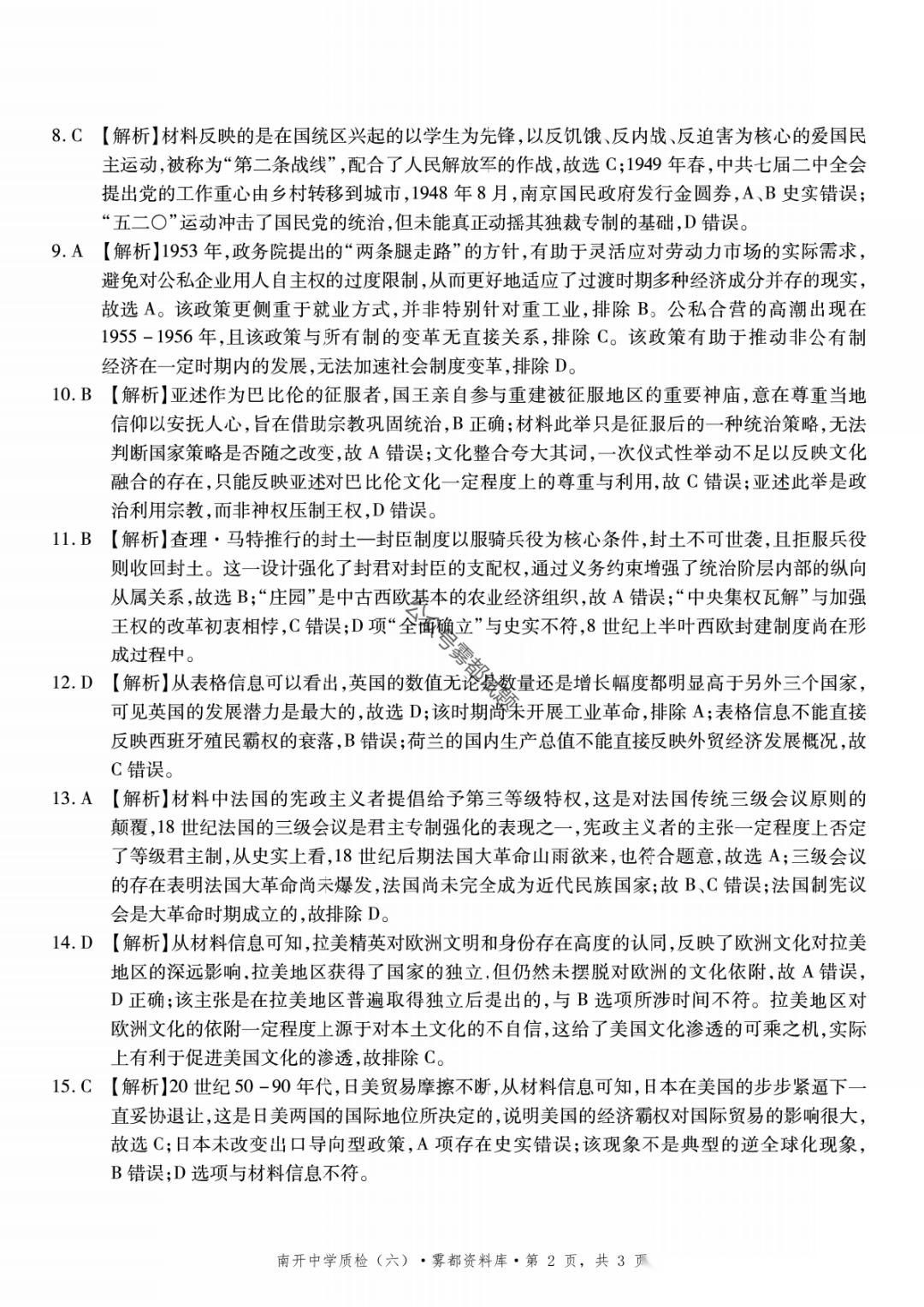 2026届重庆南开中学高三3月联考六语文、数学、物理、历史科目公布