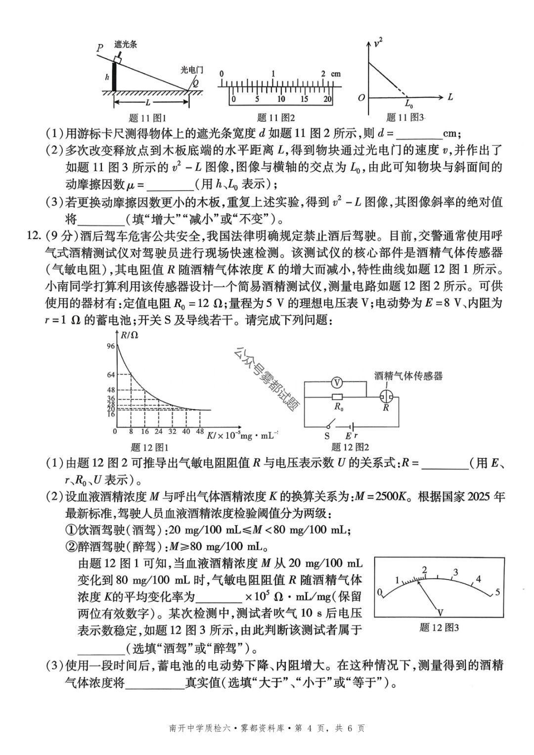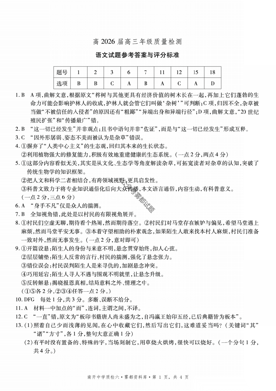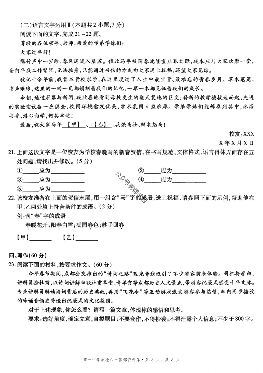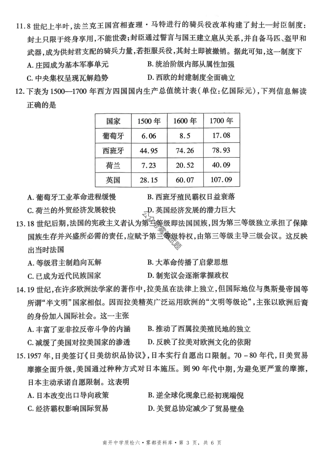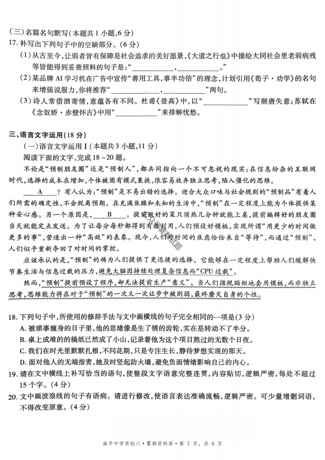 2026届重庆南开中学高三3月联考六语文、数学、物理、历史科目公布