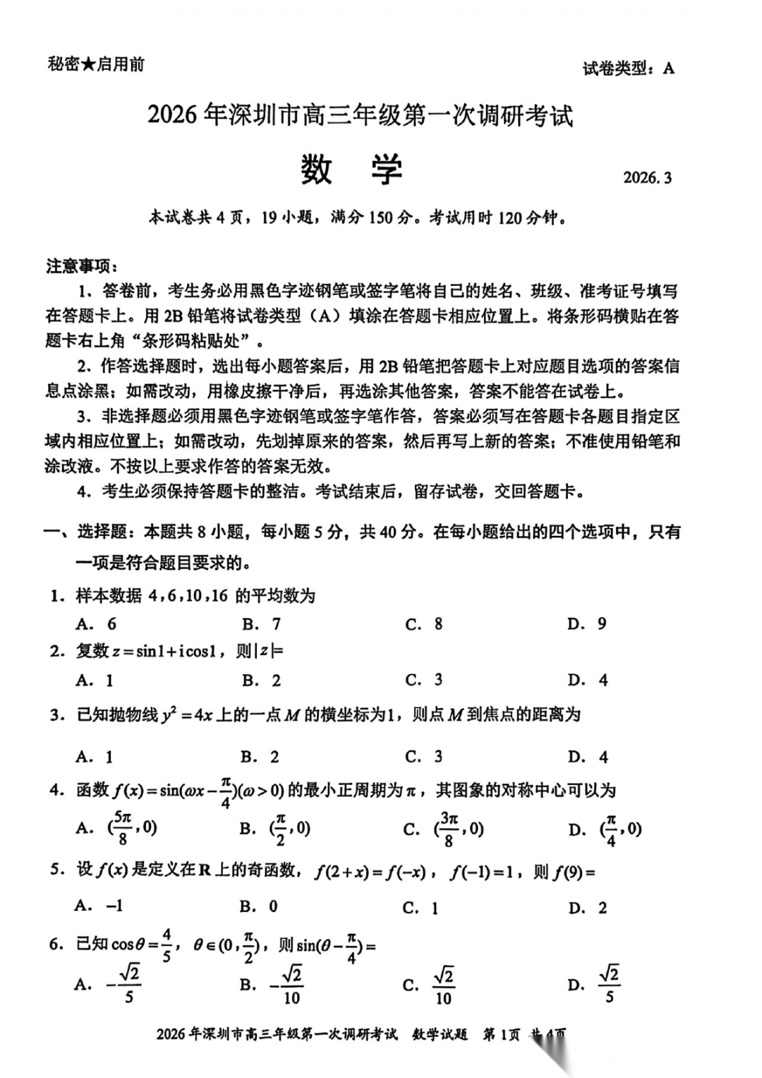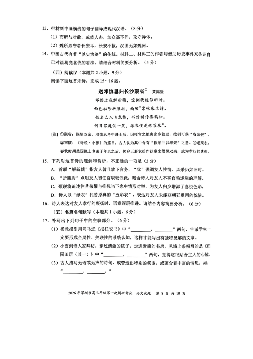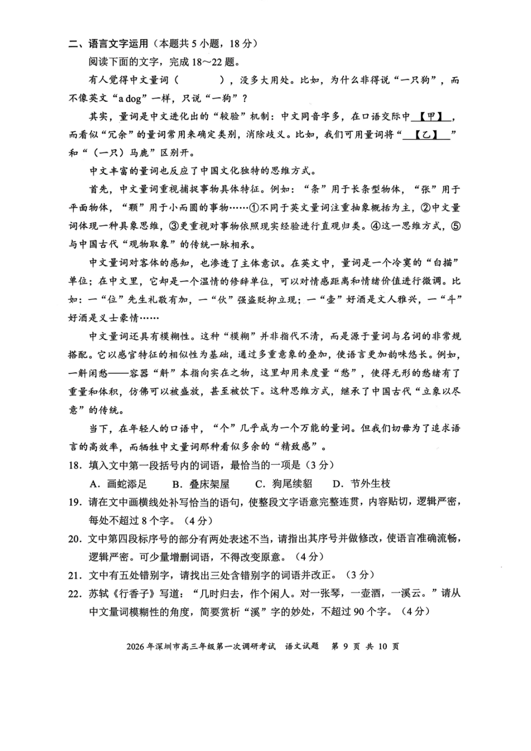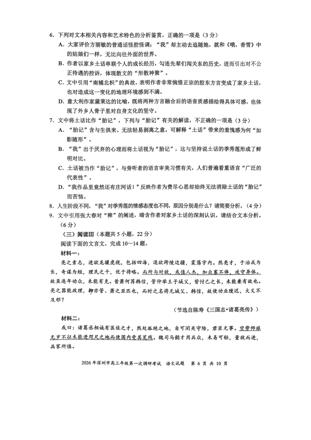 2026年深圳高三一模语文、数学试卷及参考答案