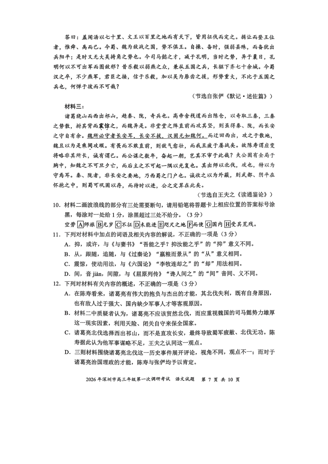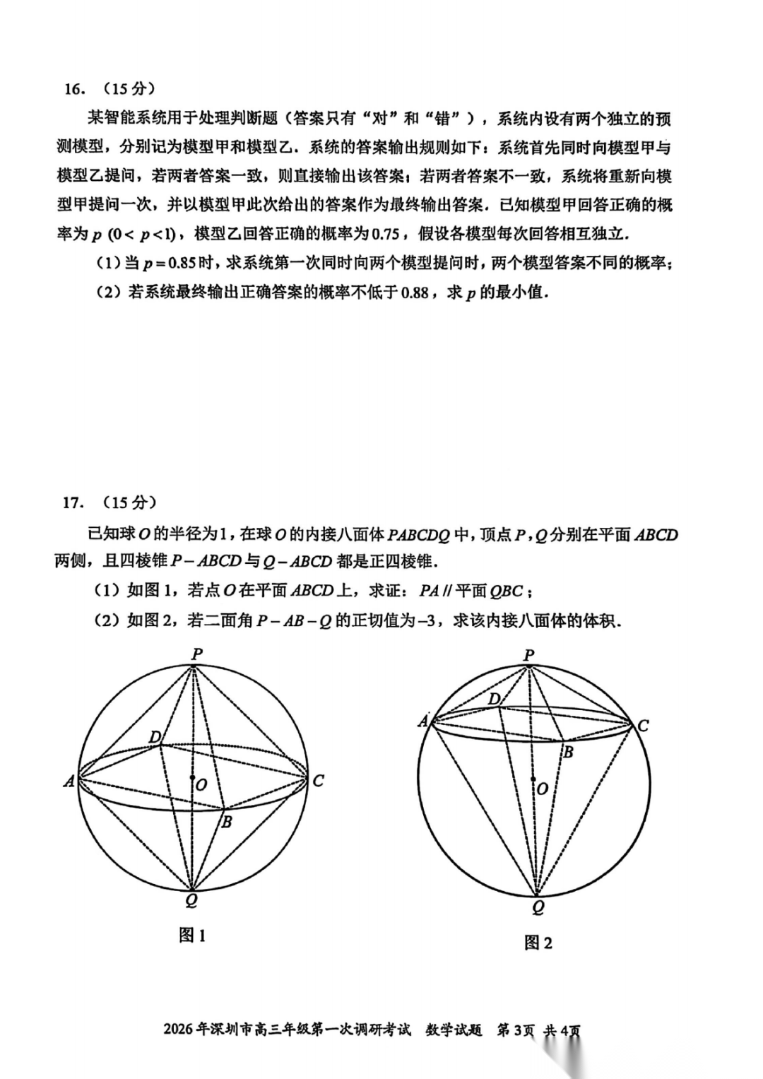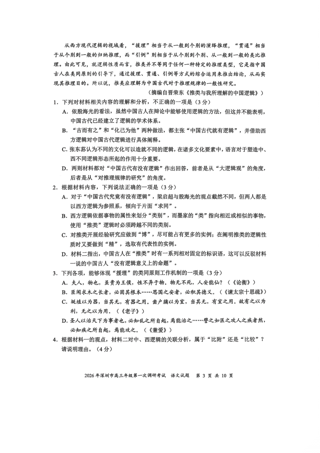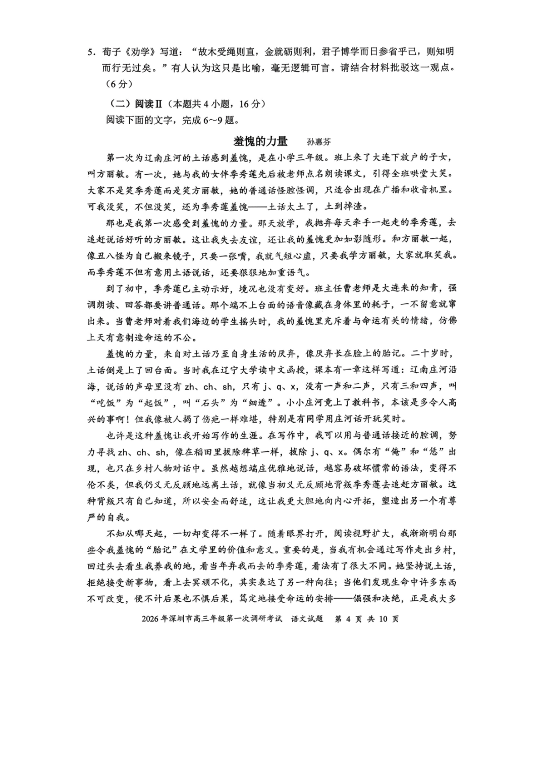 2026年深圳高三一模语文、数学试卷及参考答案