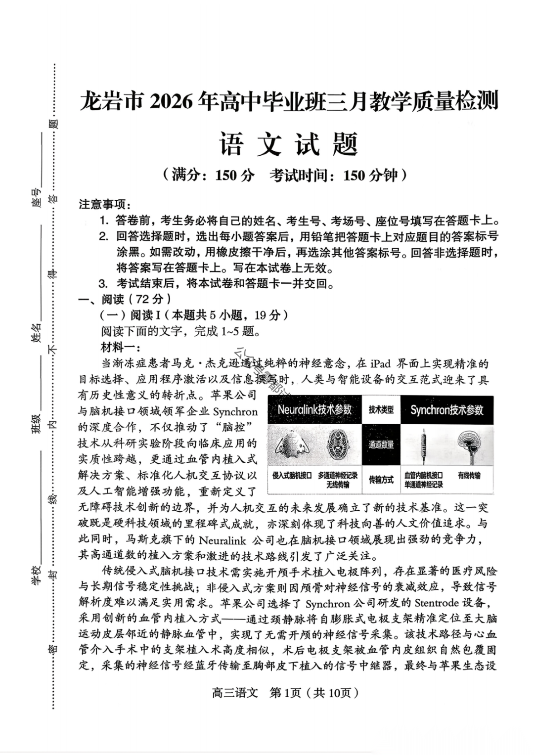 龙岩市2026年高中毕业班三月教学质量检测第一天科目公布