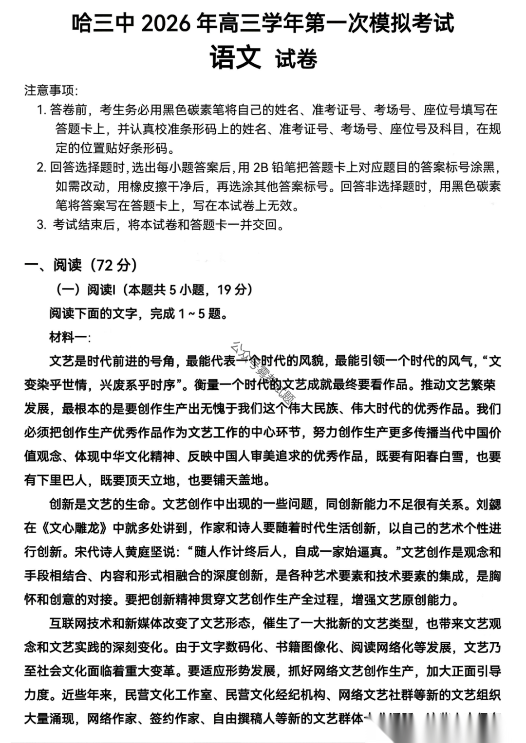 哈三中2026年高三学年第一次模拟考试第一天科目