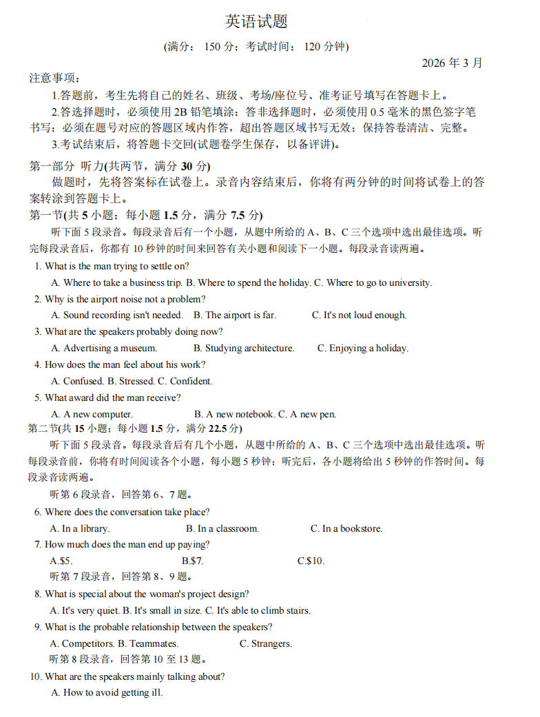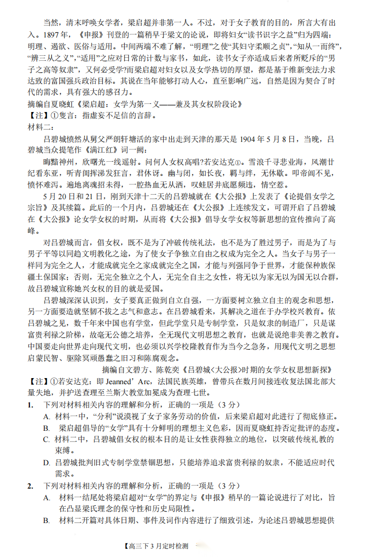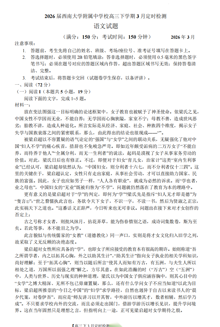 【Top50强校】【重庆卷】重庆市西南大学附属中学高2026届高三下3月月考(3.1-3.2) 全科试卷+答案