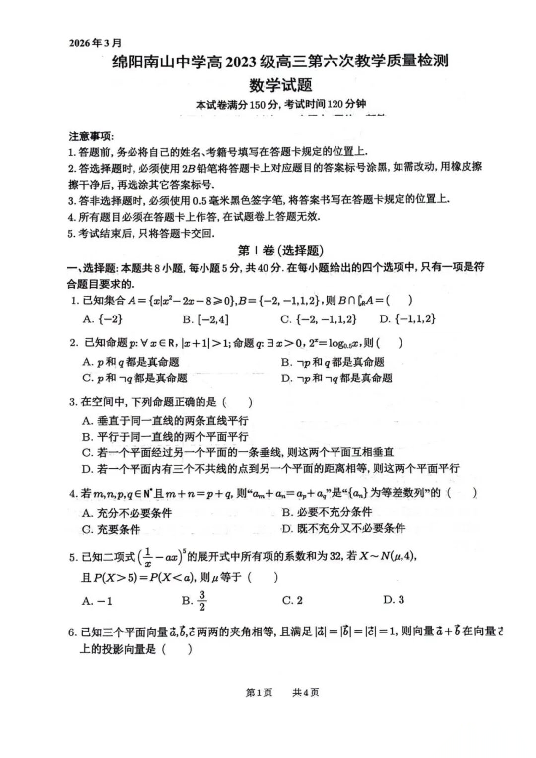 【全科】四川省绵阳南山中学2026届高三第六次教学质量检测