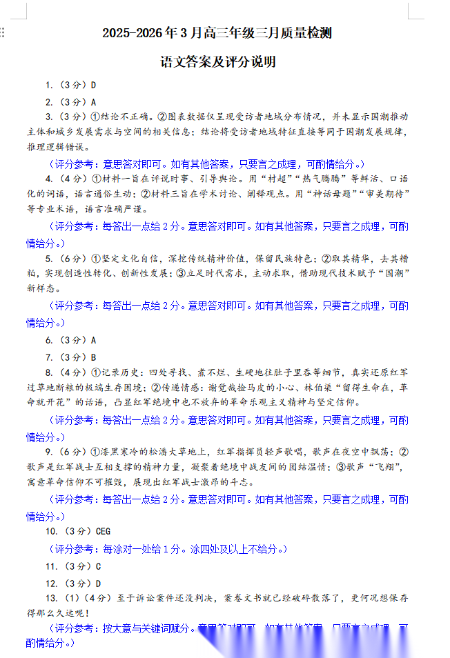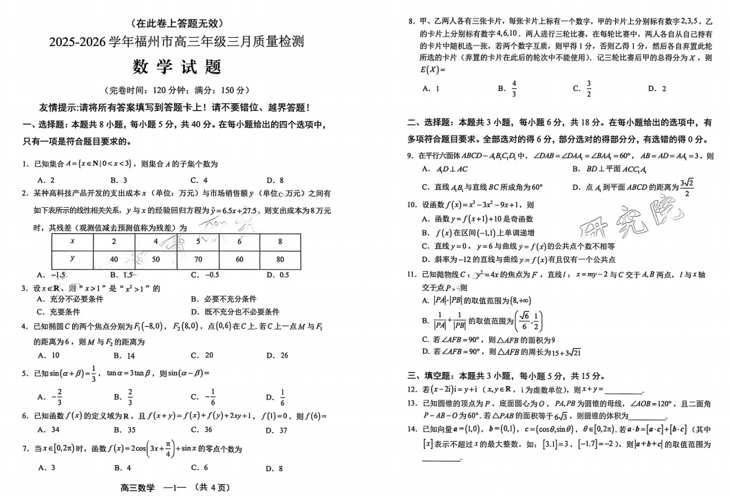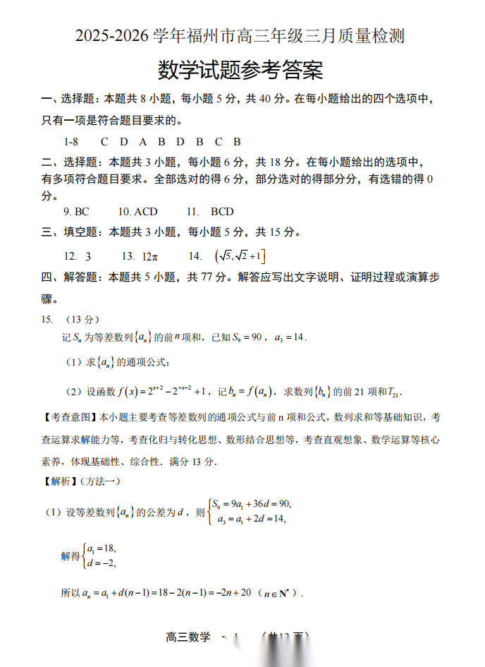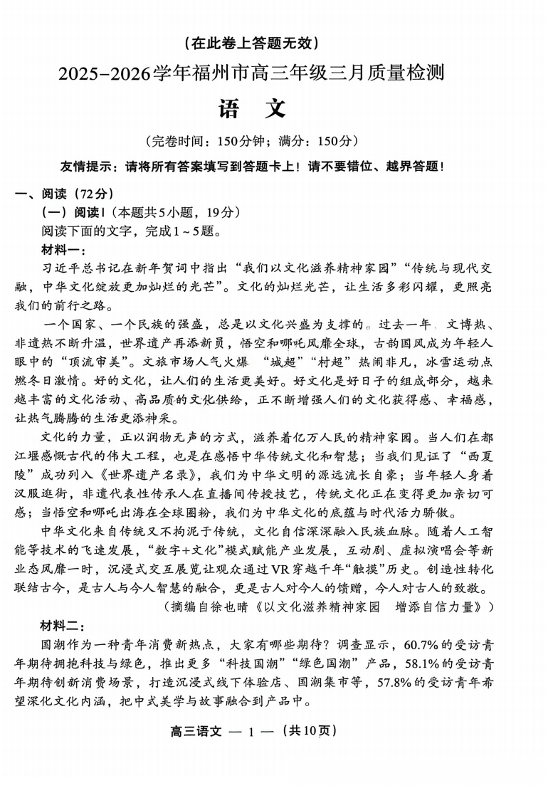 【福建卷】福建省福州市2025-2026学年福州市高三年级三月质量检测(3.5-3.7) 数学语文试题卷+答题卡+答案