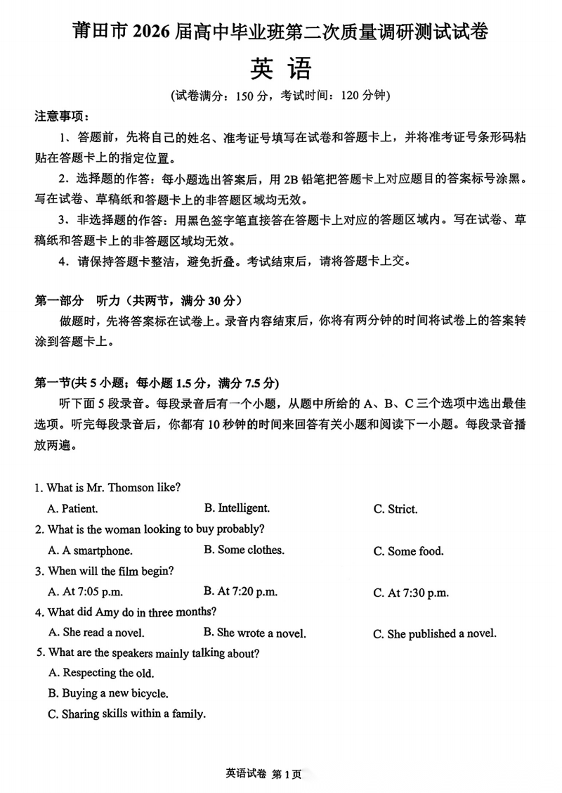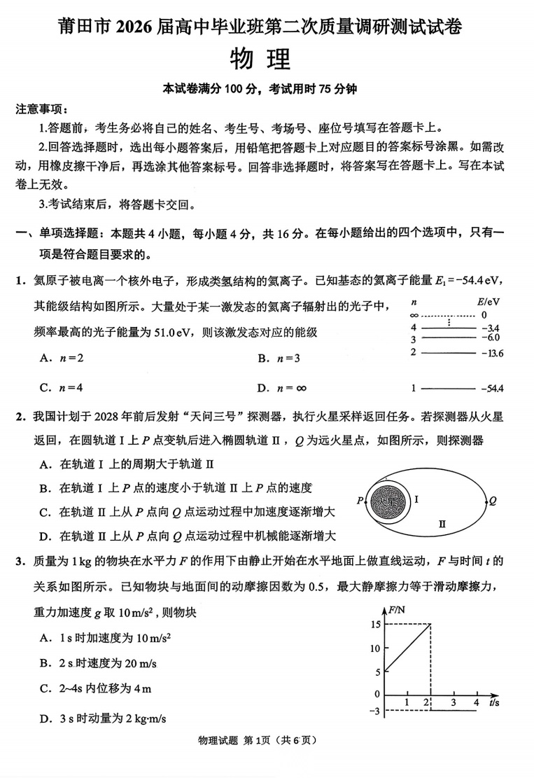 【福建卷】福建省莆田市2026届高中毕业班第二次质量调研测试试卷(莆田二检)(3.4-3.6) 数学物理英语语文试题卷+答案