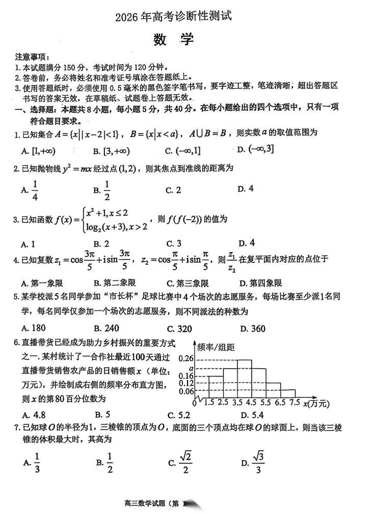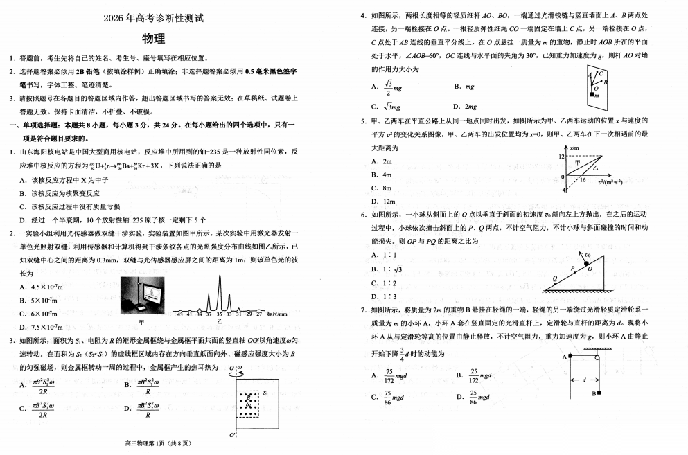 【山东卷】山东省烟台市2026年高三下学期高考诊断性测试(烟台一模)(3.4-3.6) 数学物理生物语文地理政治试题卷+答案