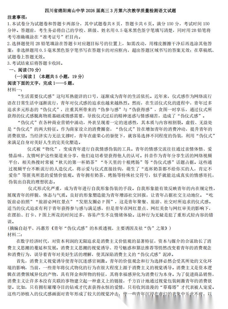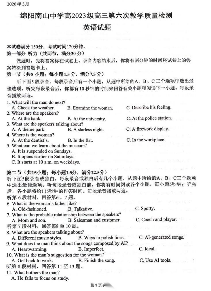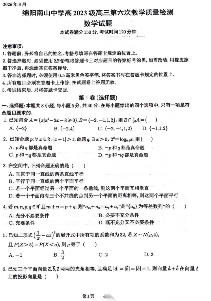 【四川卷】四川省绵阳南山中学2026届高三第六次(3月)教学质量检测(3.1-3.2) 全科试卷+答案