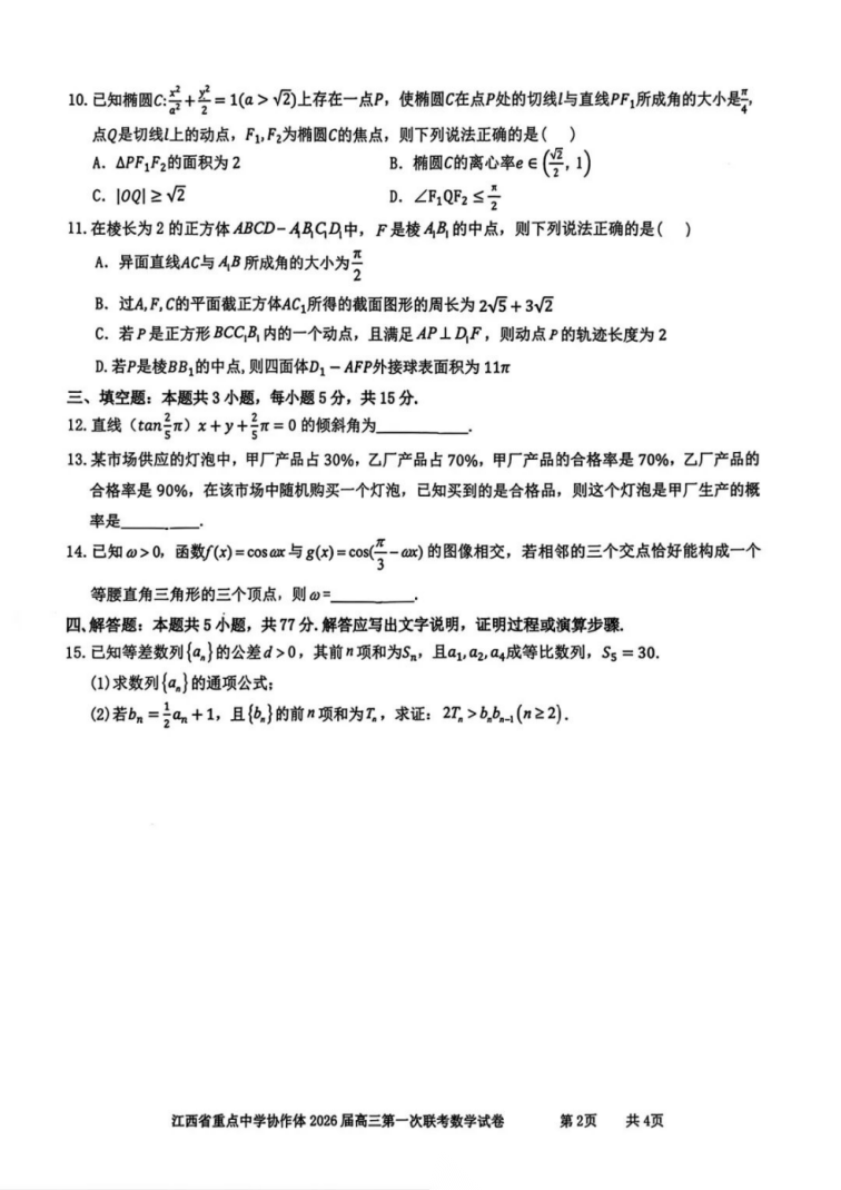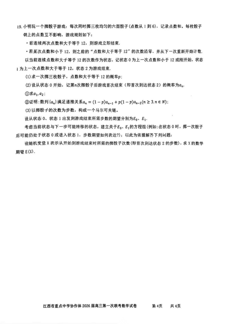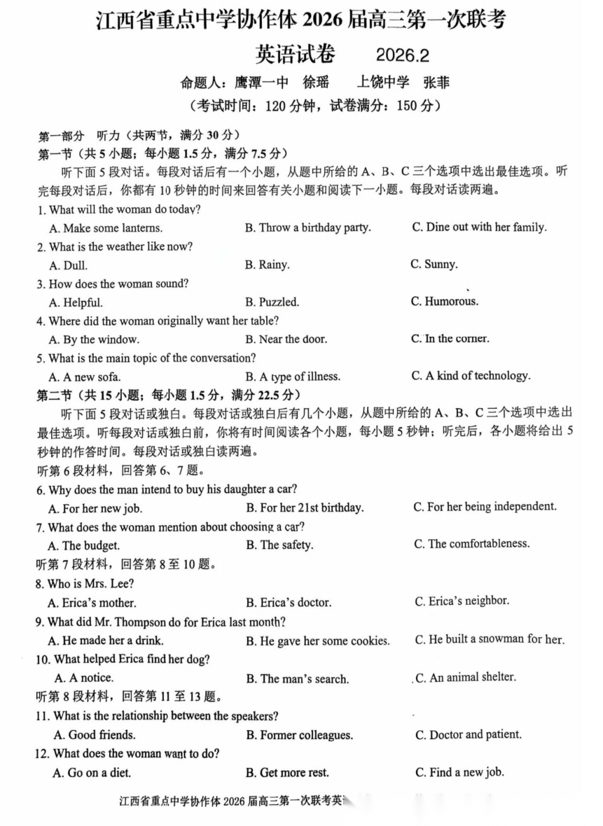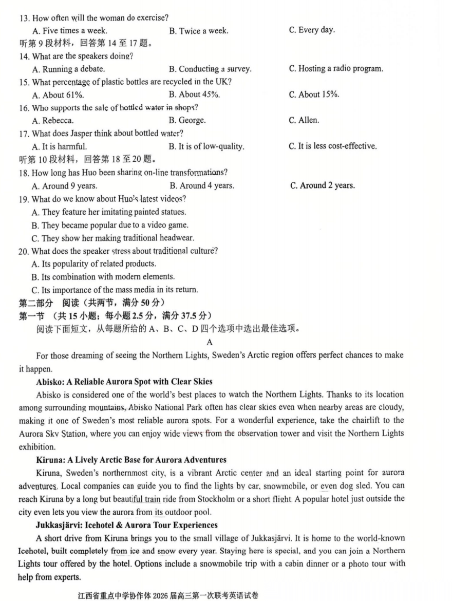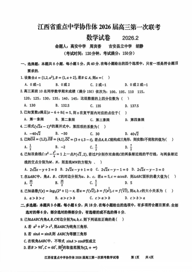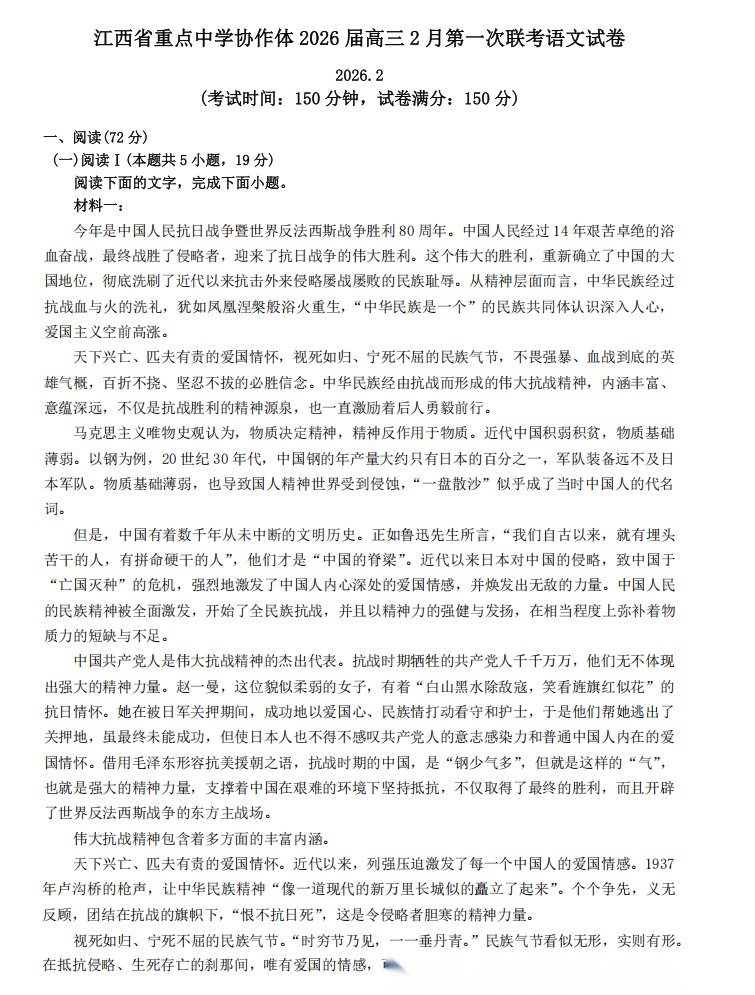 【江西卷】江西省重点中学协作体2026届高三第一次联考(2.27-2.28) 全科试卷(缺物理)+答案