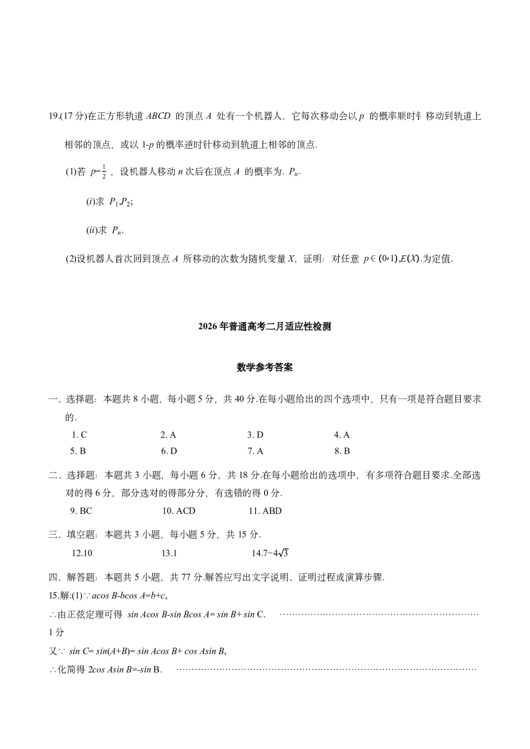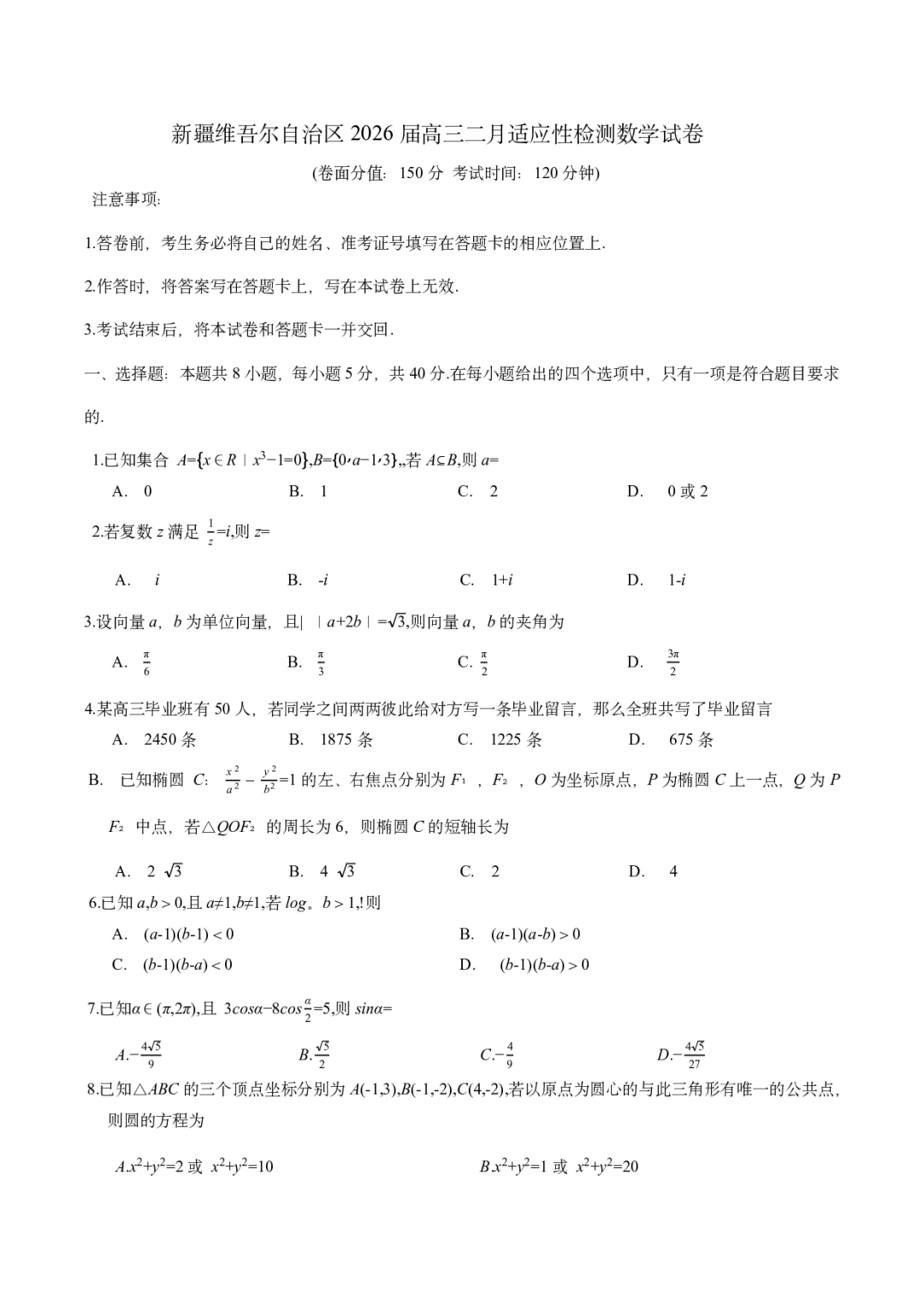 新疆2026届高三上学期普通高考二月适应性检测