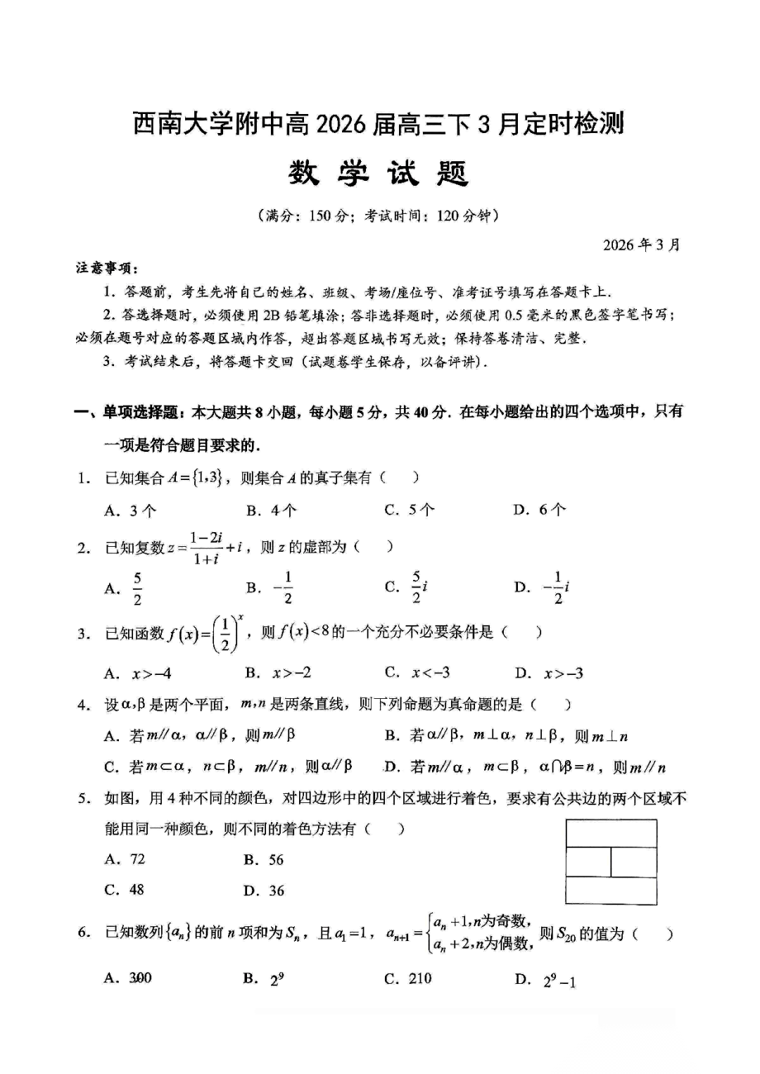 重庆市西南大学附属中学2026届高三下学期3月入学考试