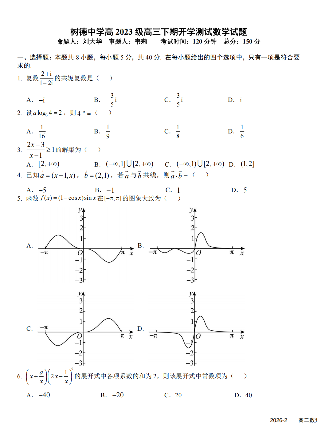 湖南师范大学附属中学2026届高三2月月考试卷(七) 湖南师范大学附属中学2026届高三2月月考试卷(七)
