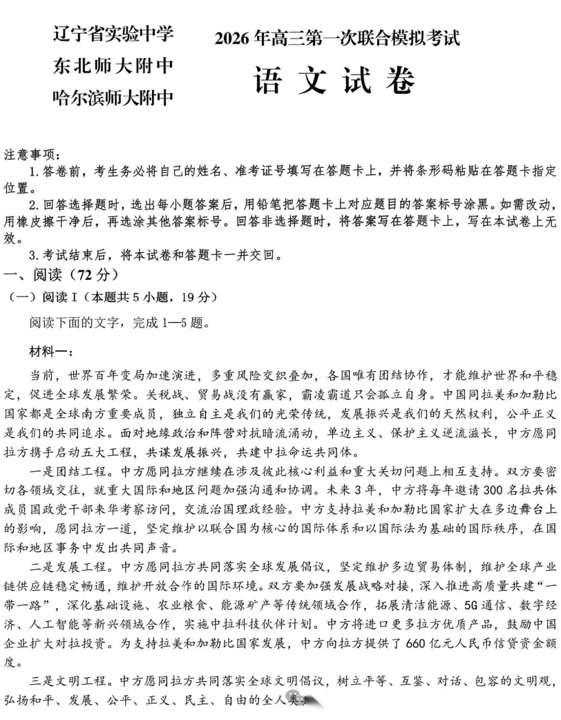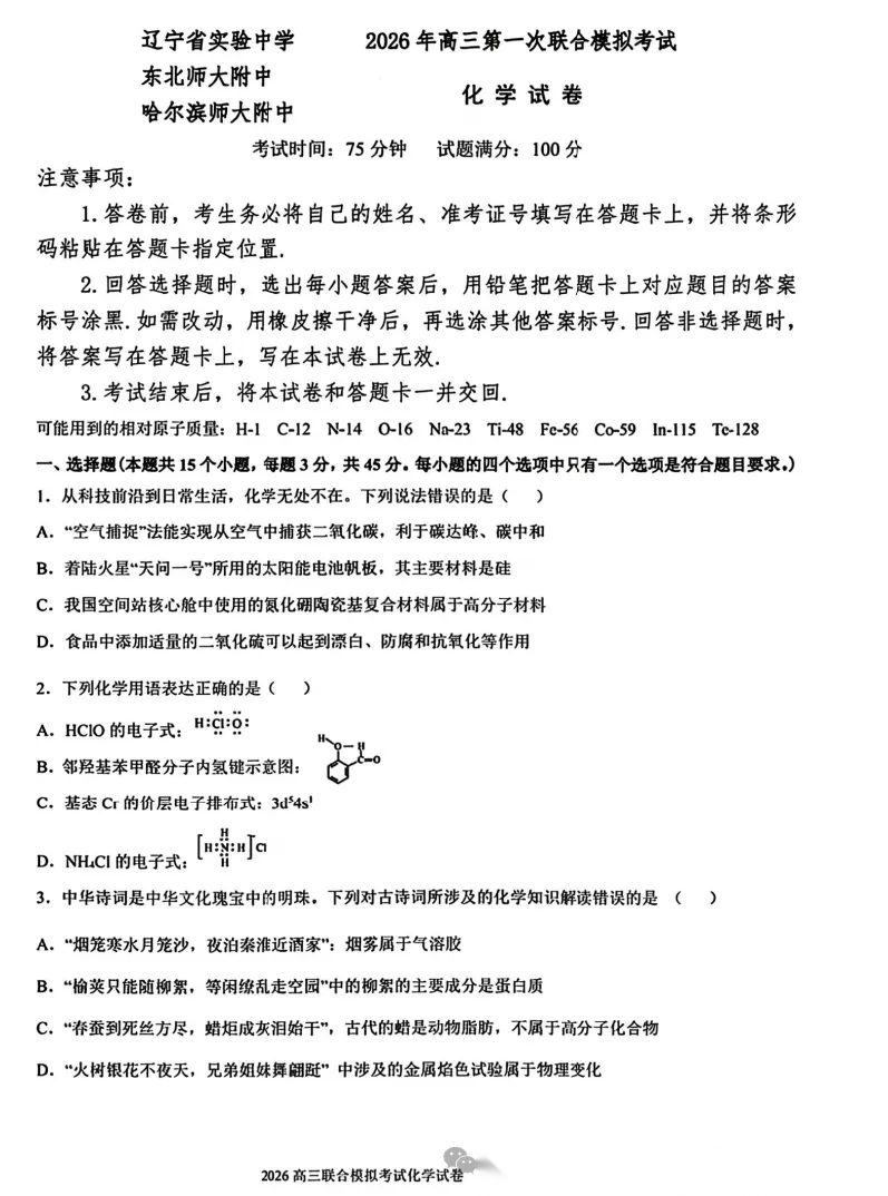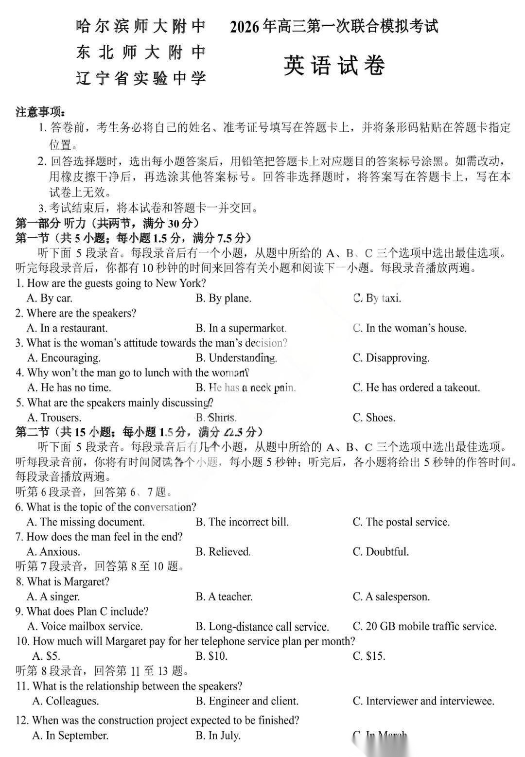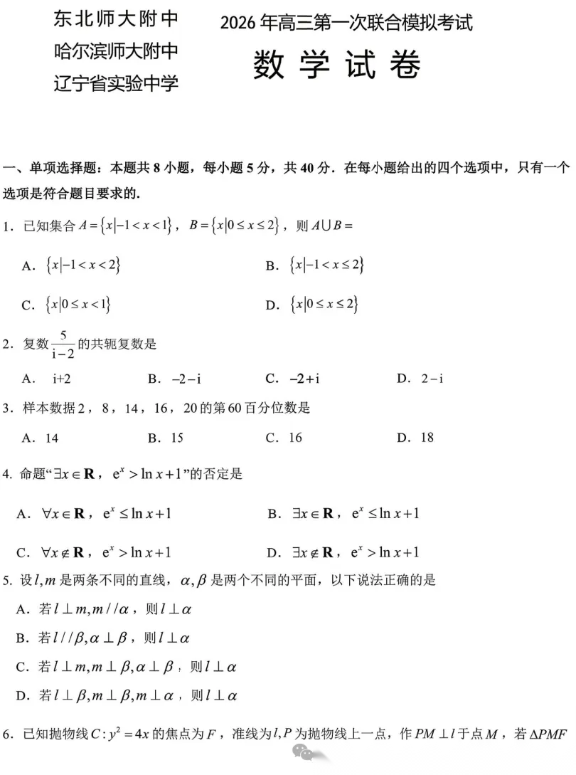 【百强校联考】【黑吉辽蒙卷】东北三省东北师大哈师大附中辽宁实验三校2026年高三第一次联合模拟考试(三校一模)(3.5-3.6)全科试题卷+答案