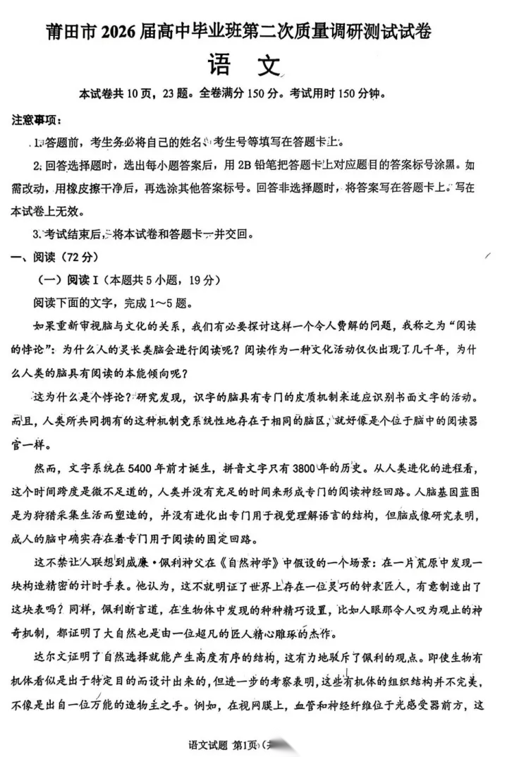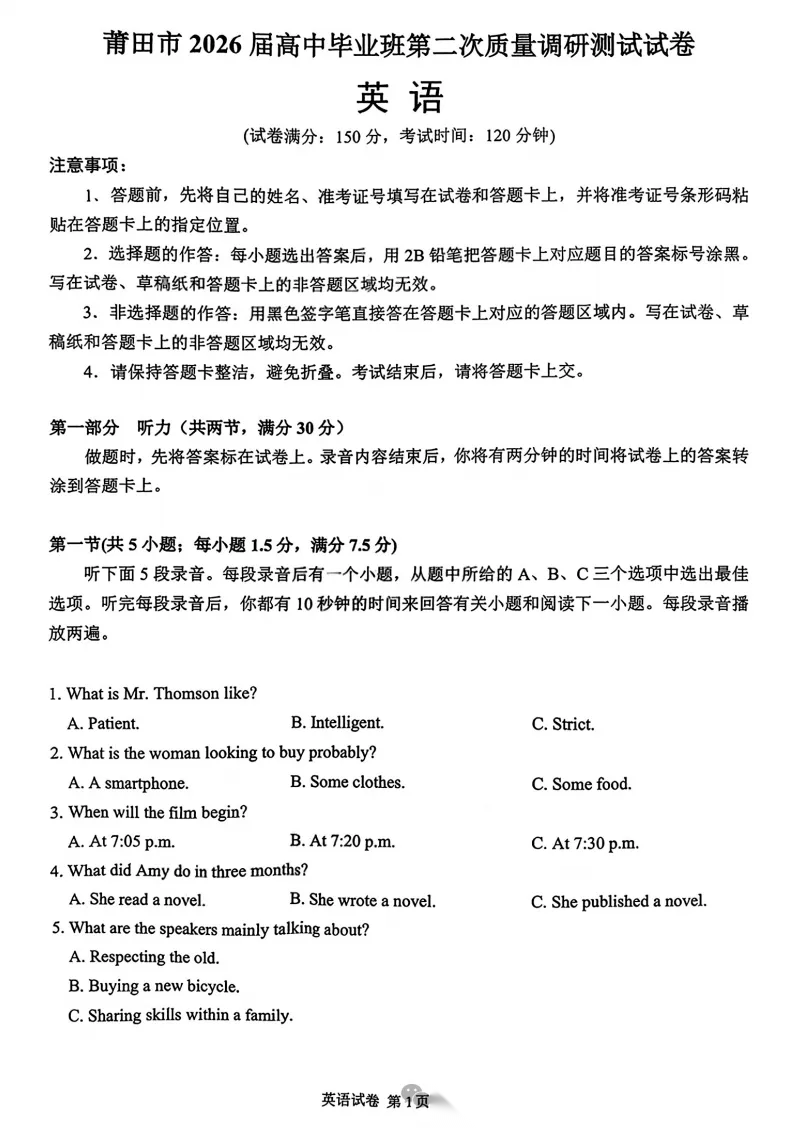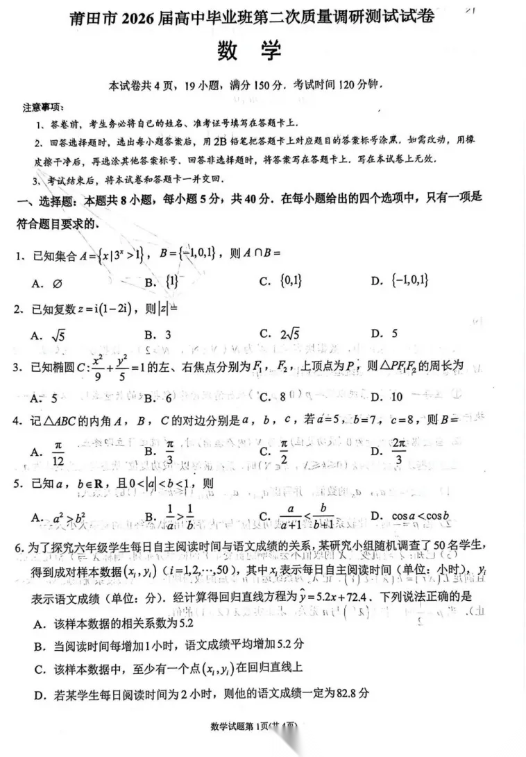 【福建卷】福建省莆田市2026届高中毕业班第二次质量调研测试试卷(莆田二检)(3.4-3.6) 全科试题卷(含日语)+答案