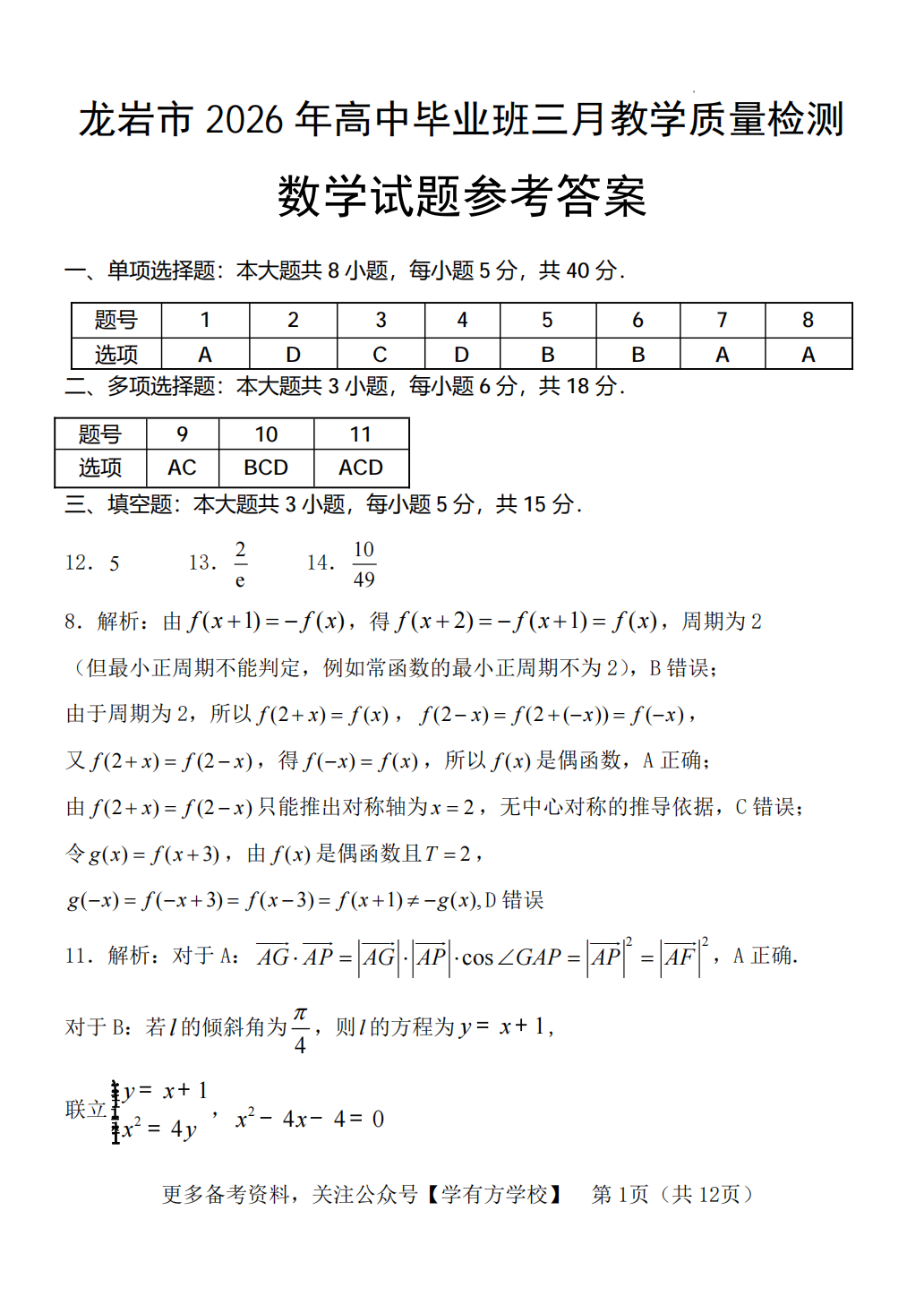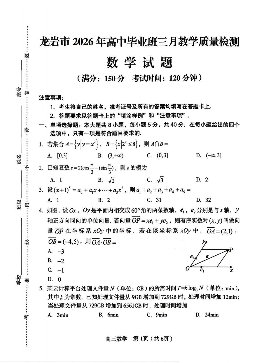 【全科】龙岩市2026年高中毕业班三月教学质量检测