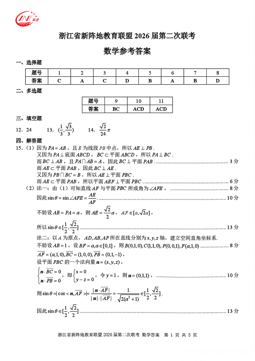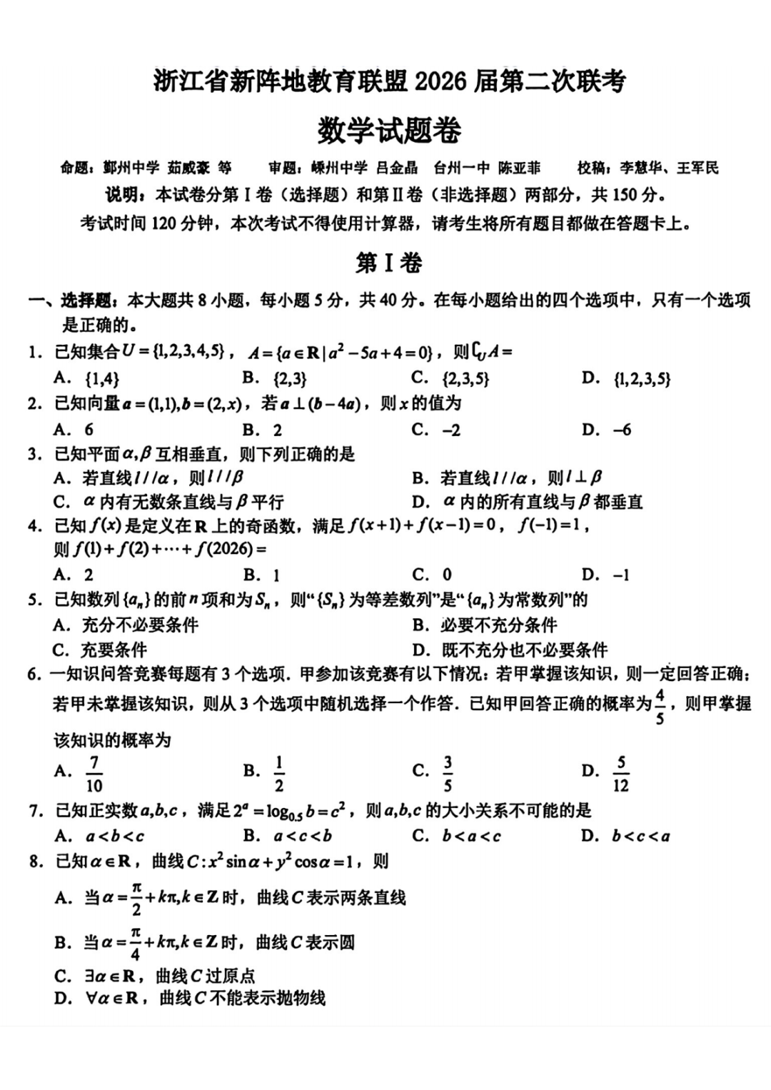 【全科】浙江省新阵地教育联盟2026届高三第二次联考
