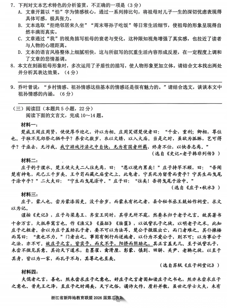 【浙江卷】浙江新阵地教育联盟2026届高三年下学期第二次联考暨开学考试(3.5-3.7) 全科试题卷+答案