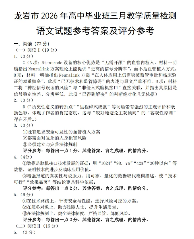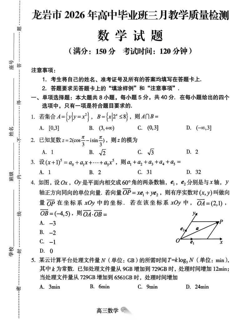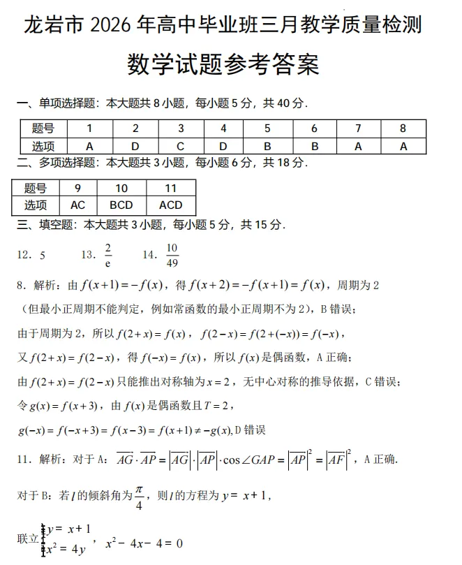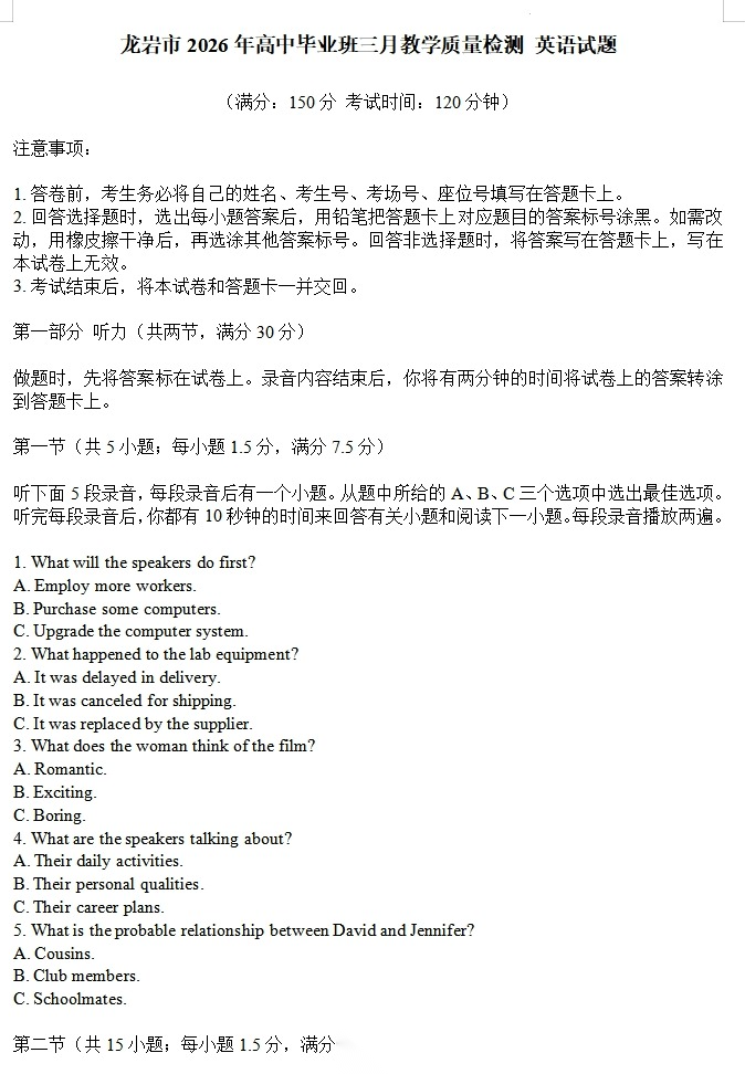 【福建卷】福建省龙岩市2026年高中毕业班三月教学质量检测(3.5-3.7) 全科试题卷+答案