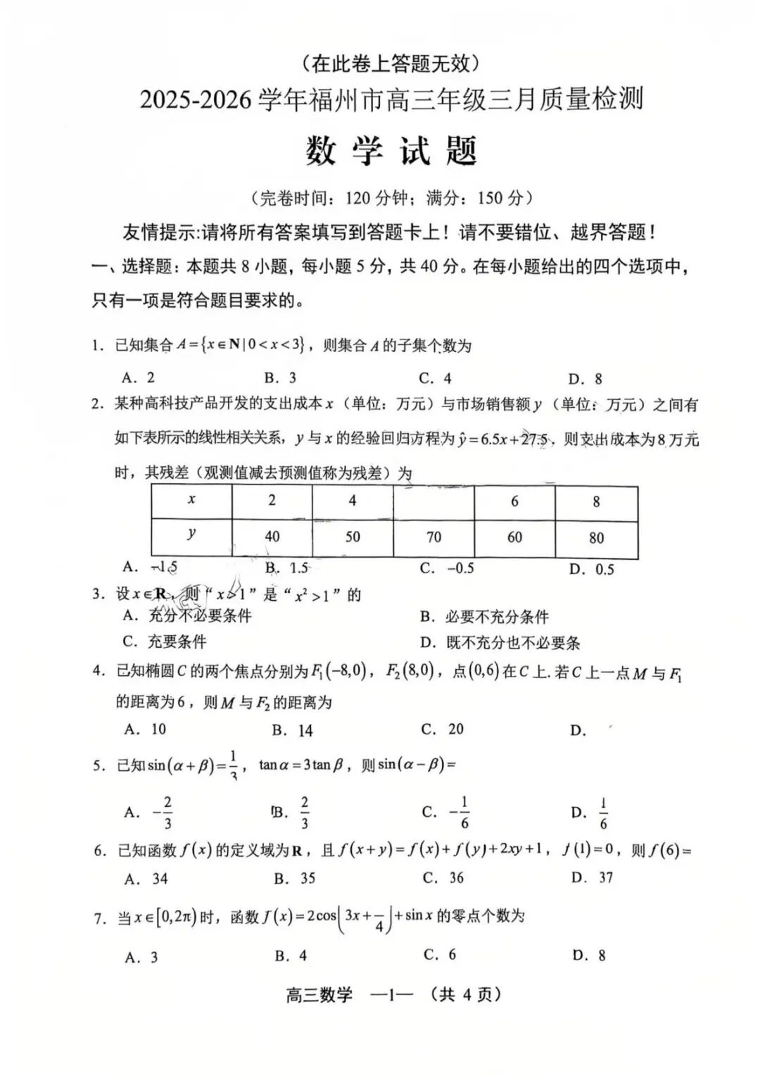 【超清无水印】:高三,福建省福州市2025-2026学年高三三月质量检测(福州二模)