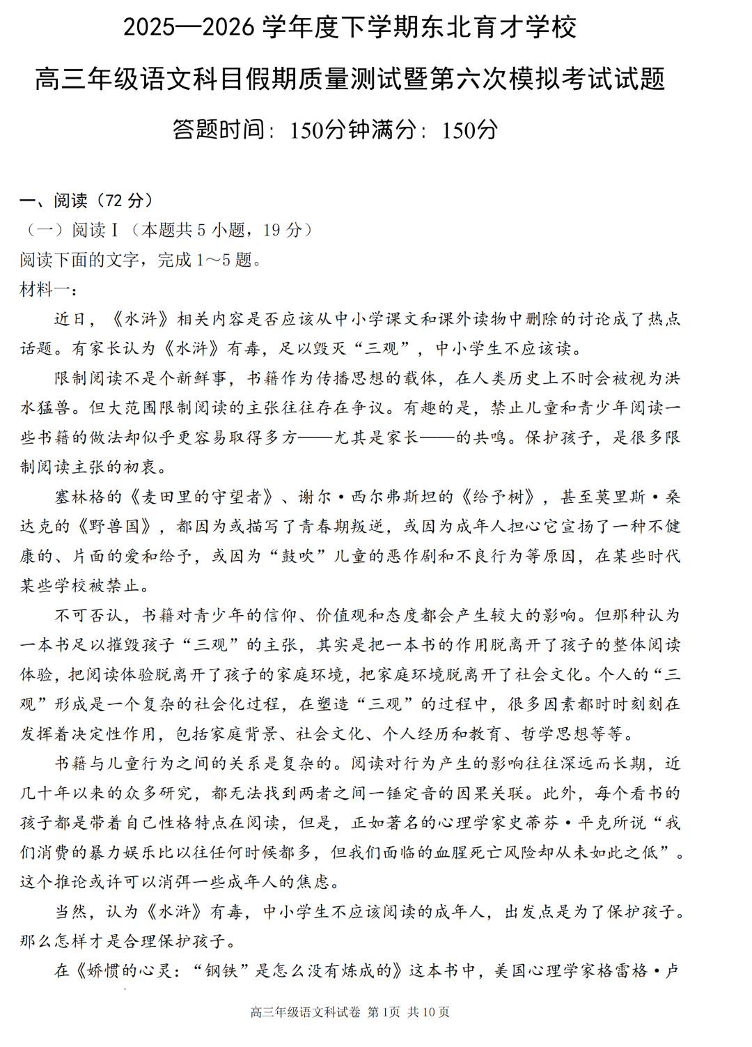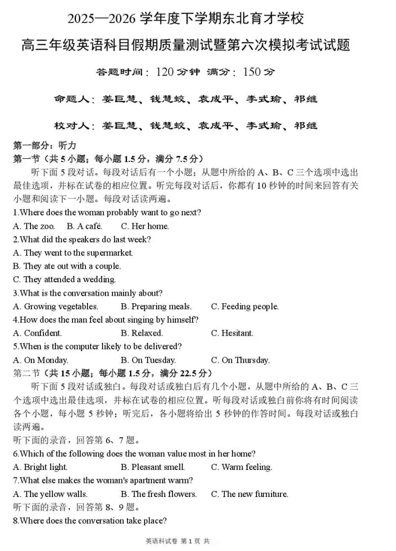 【Top25强校】【黑吉辽蒙卷】东北育才学校2025-2026学年度高三年级下学期假期质量测试暨第六次模拟考试(3.6-3.7)全科试卷(缺历史)+答案