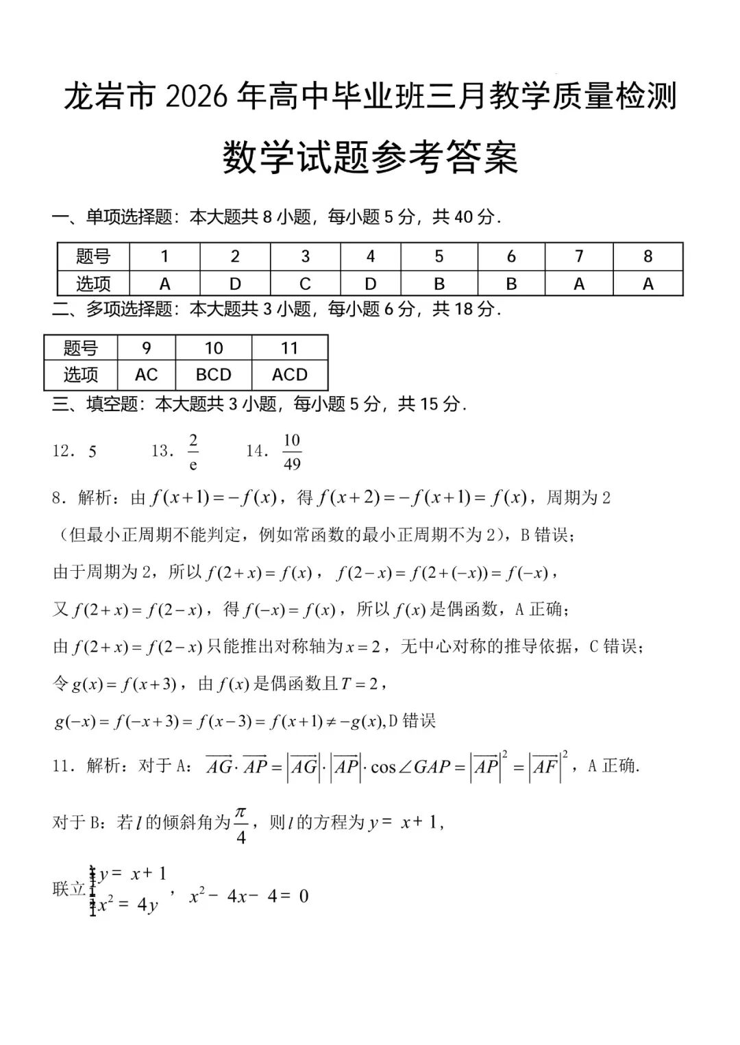 【全科】福建省龙岩市2026年高中毕业班三月教学质量检测