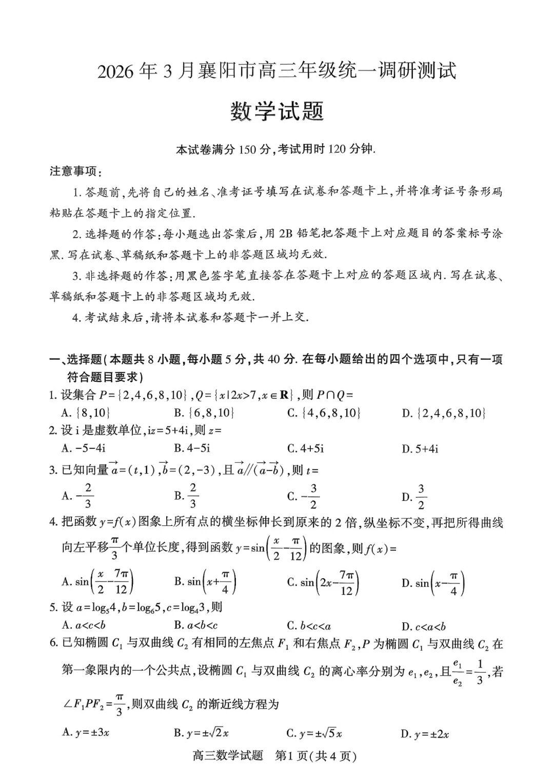 【全科】湖北襄阳市2026届高三年级3月统一调研测试