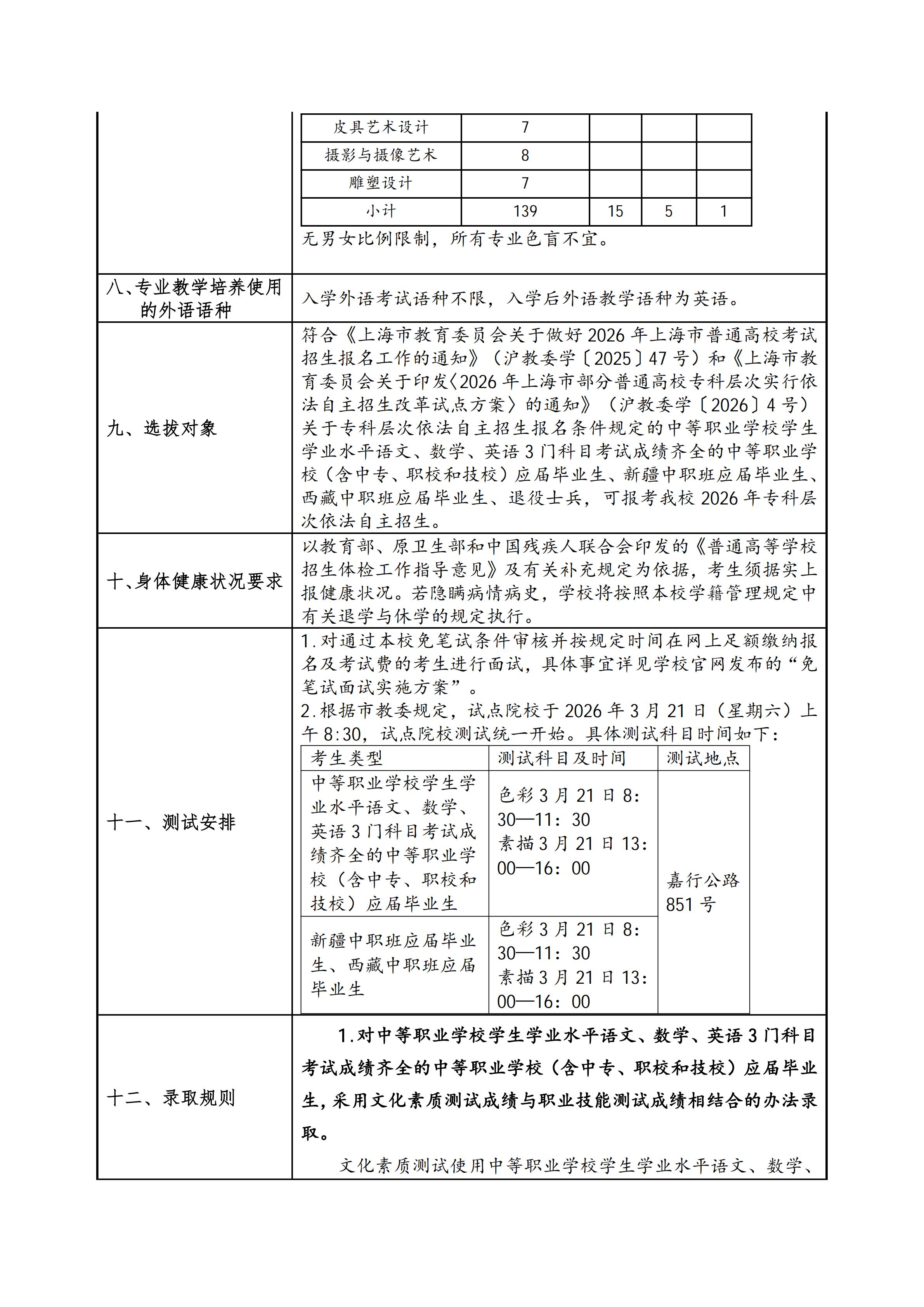上海工艺美术职业学院2026年专科层次依法自主招生章程