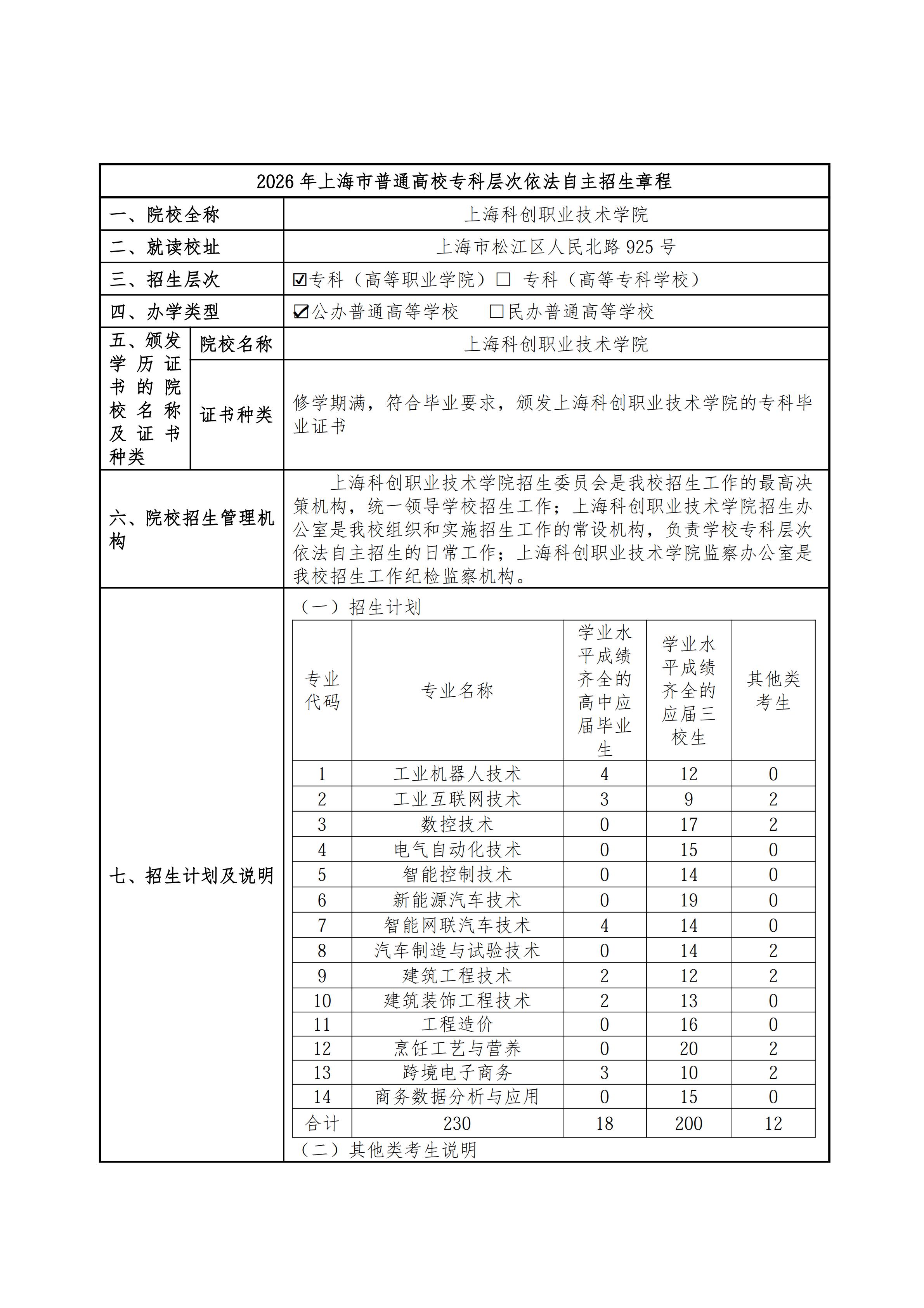 上海科创职业技术学院2026年专科层次依法自主招生章程 2026-03-09 -