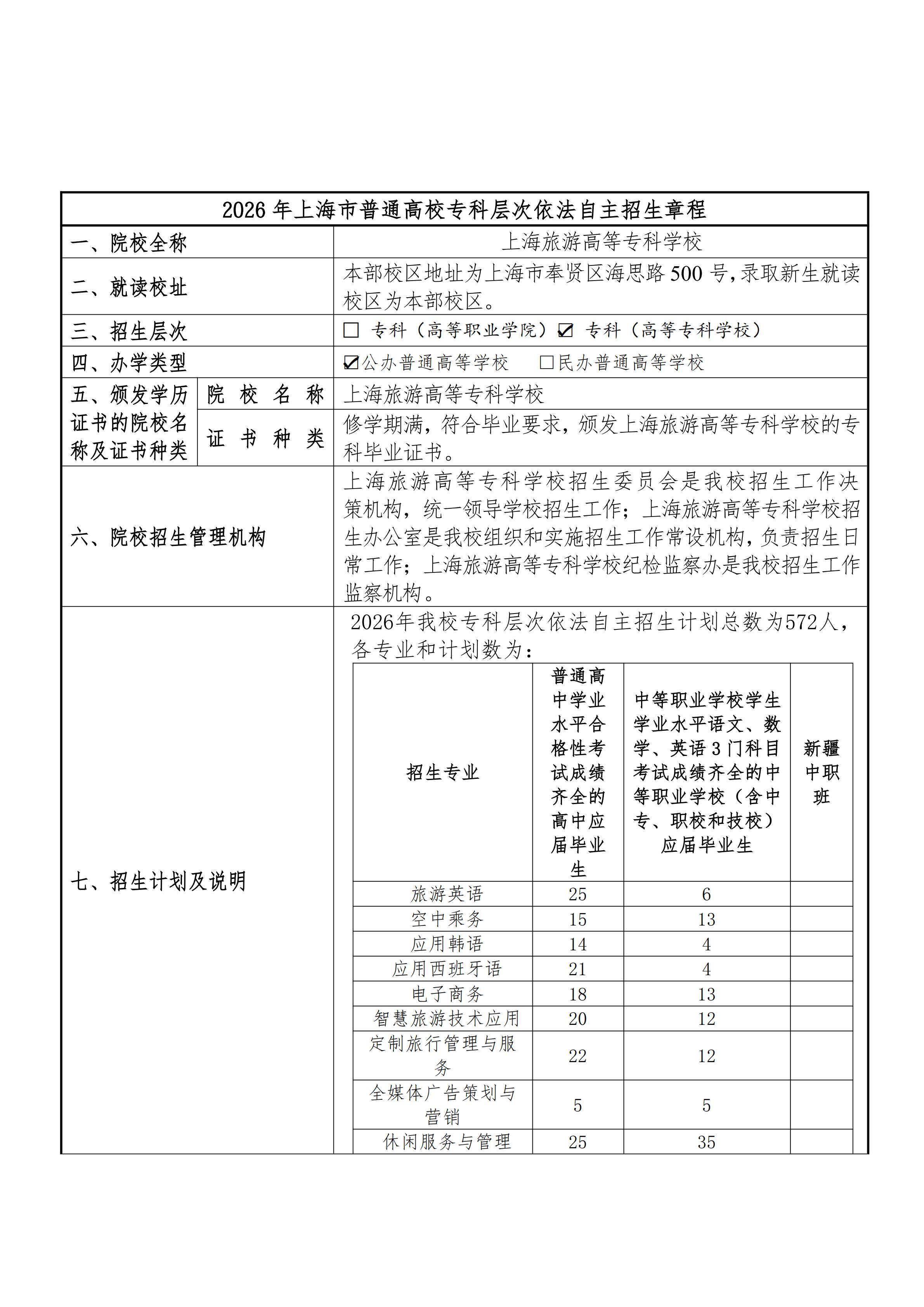 上海旅游高等专科学校2026年专科层次依法自主招生章程 2026-03-09 -
