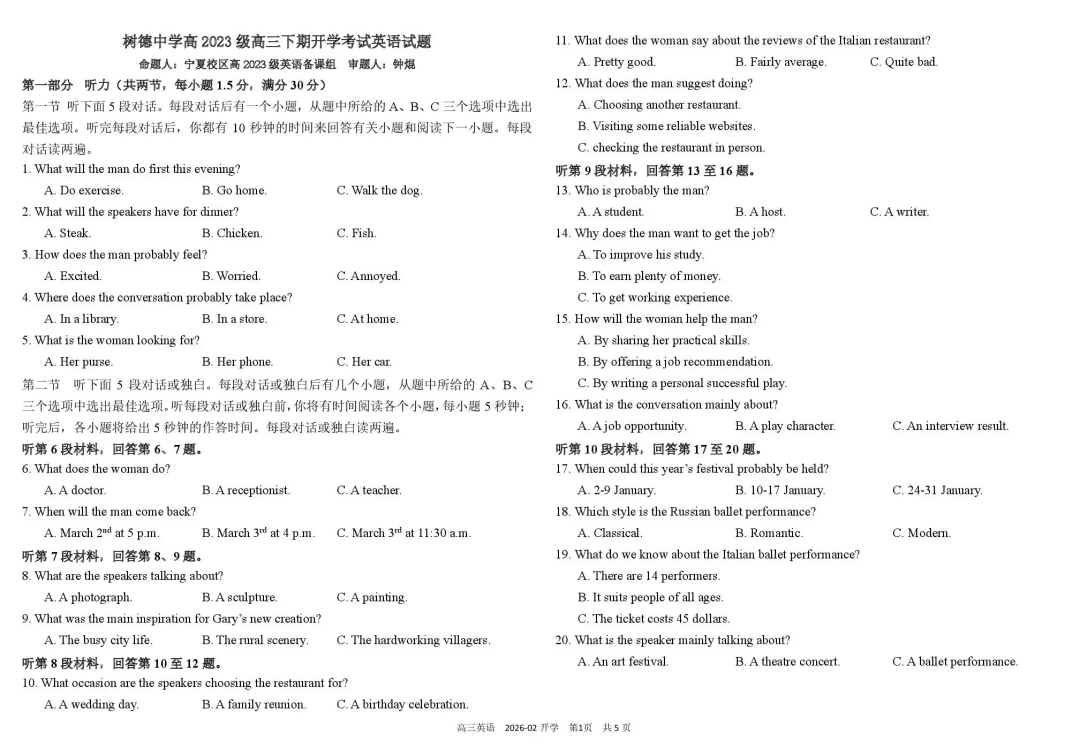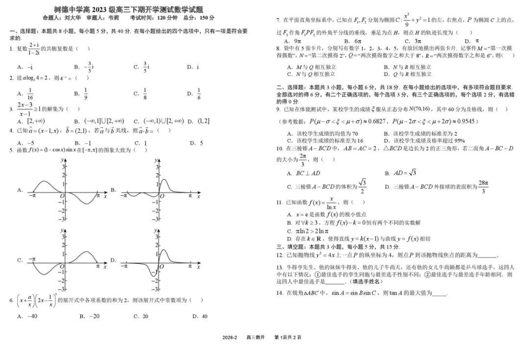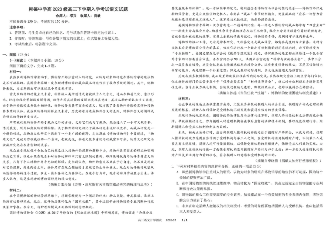 【百强校】【四川卷】四川省成都市树德中学高2023级(2026届)高三下学期入学开学考试(3.3-3.4) 全科试题卷+答案