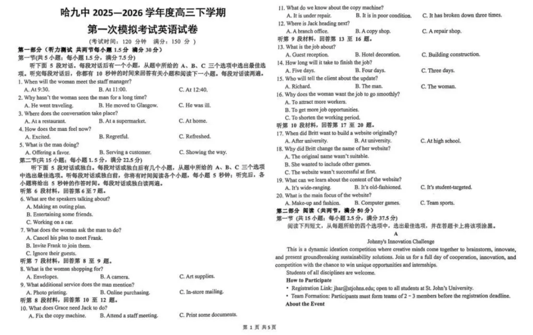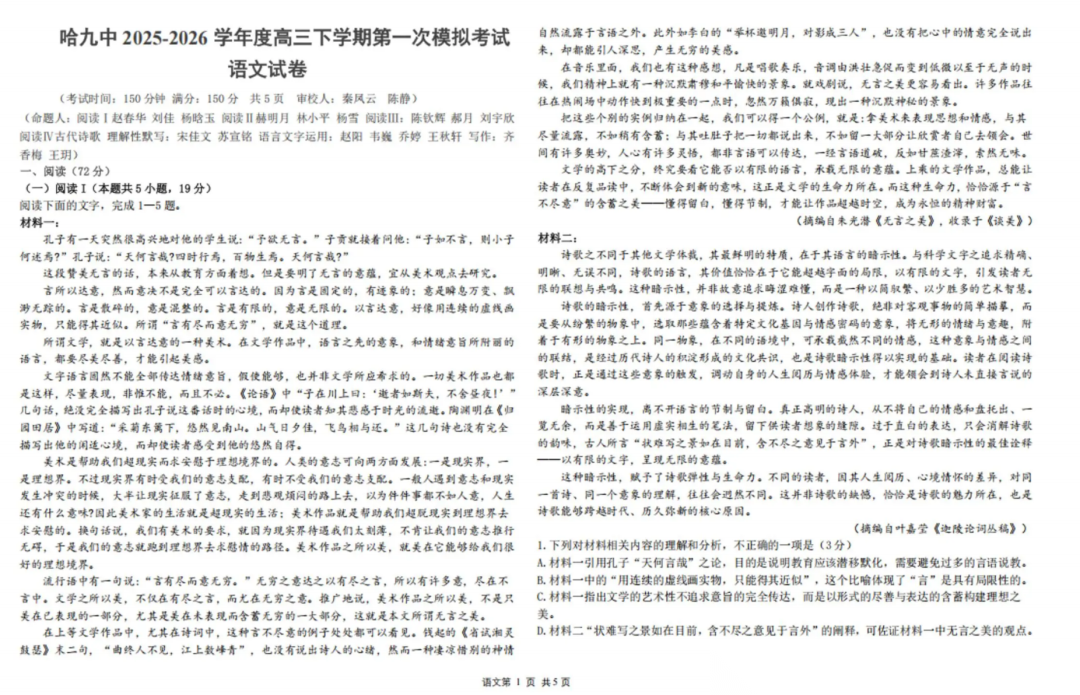 【黑吉辽蒙卷】黑龙江省哈尔滨市第九中学2025~2026学年度高三下学期第一次模拟考试(哈九中一模)(3.4-3.6) 全科试题卷(缺生物政治)+答案