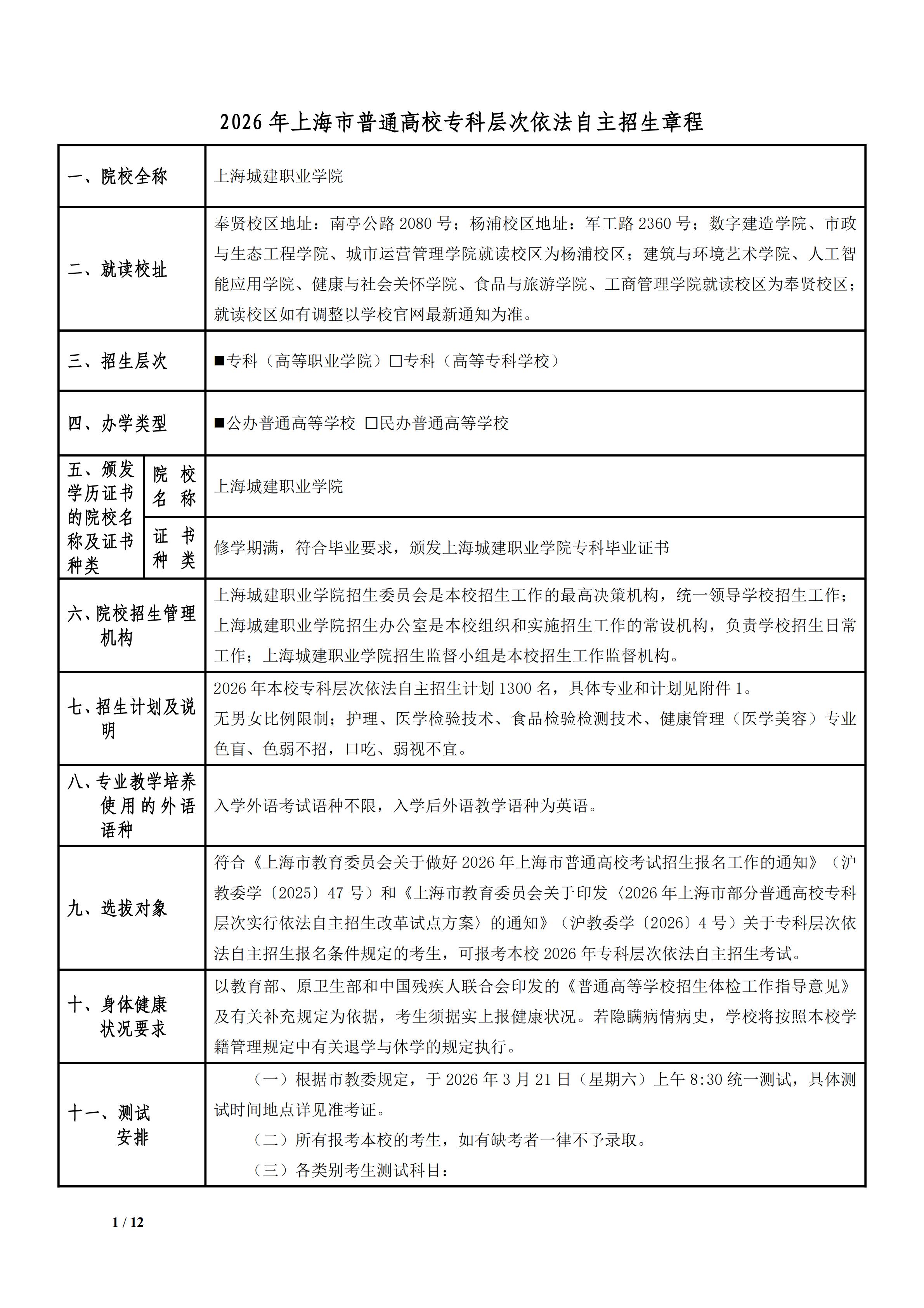 上海城建职业学院2026年专科层次依法自主招生章程 2026-03-09 -