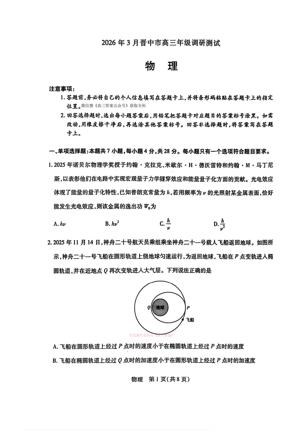 【晋中二模】2026年3月晋中高三年级调研测试全科下载