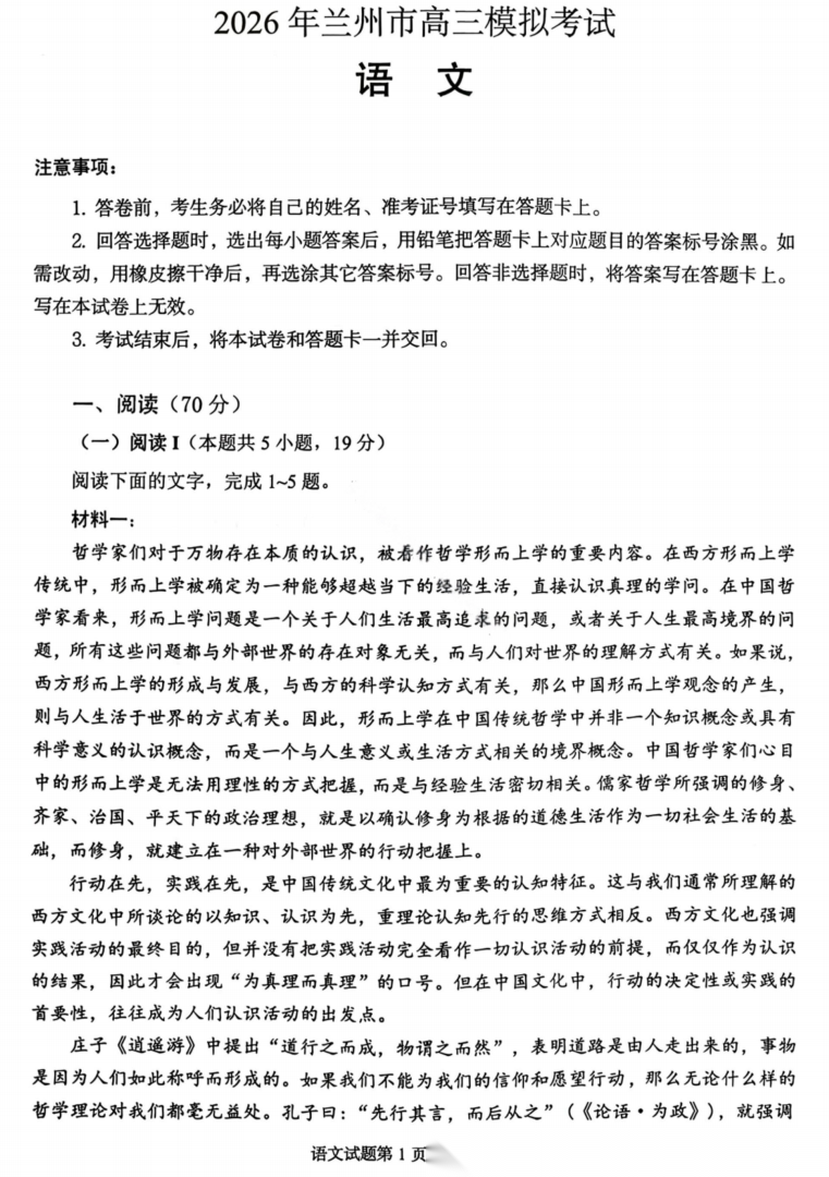 【甘肃卷】甘肃省兰州市2026年兰州市高三3月模拟考试(兰州一诊)(3.11-3.13) 数学语文试题卷+答案