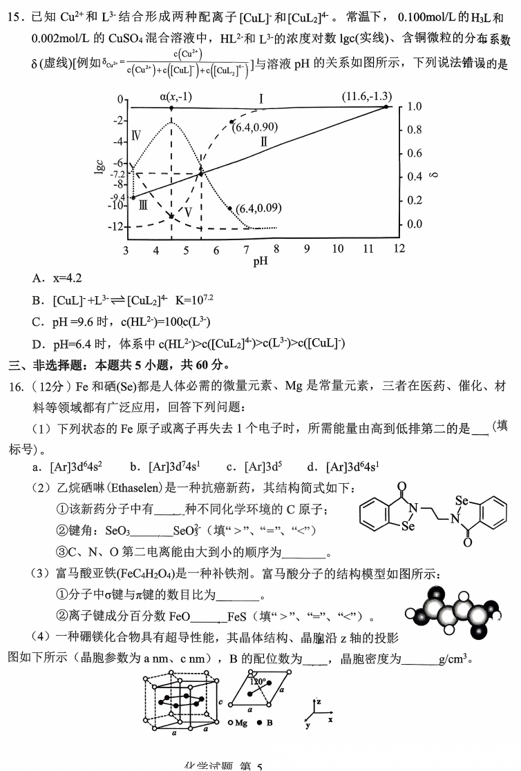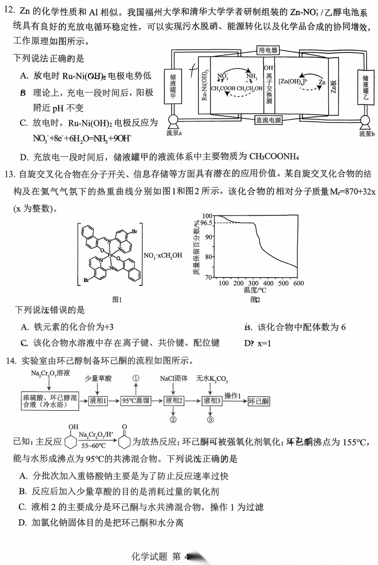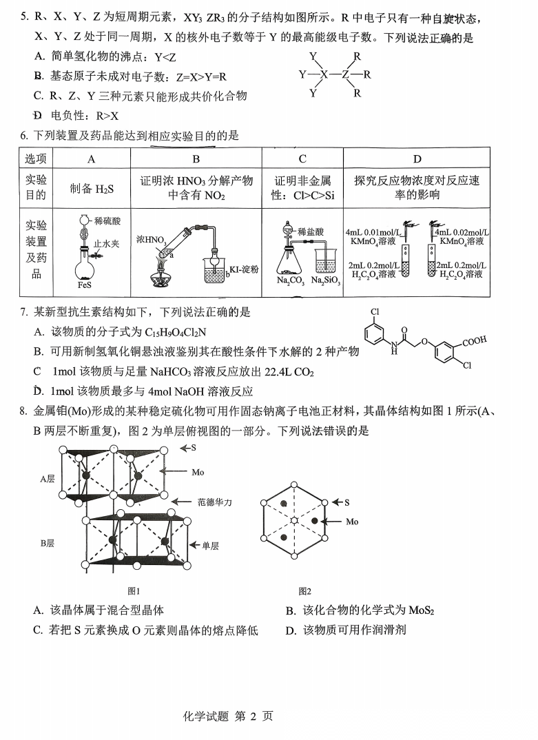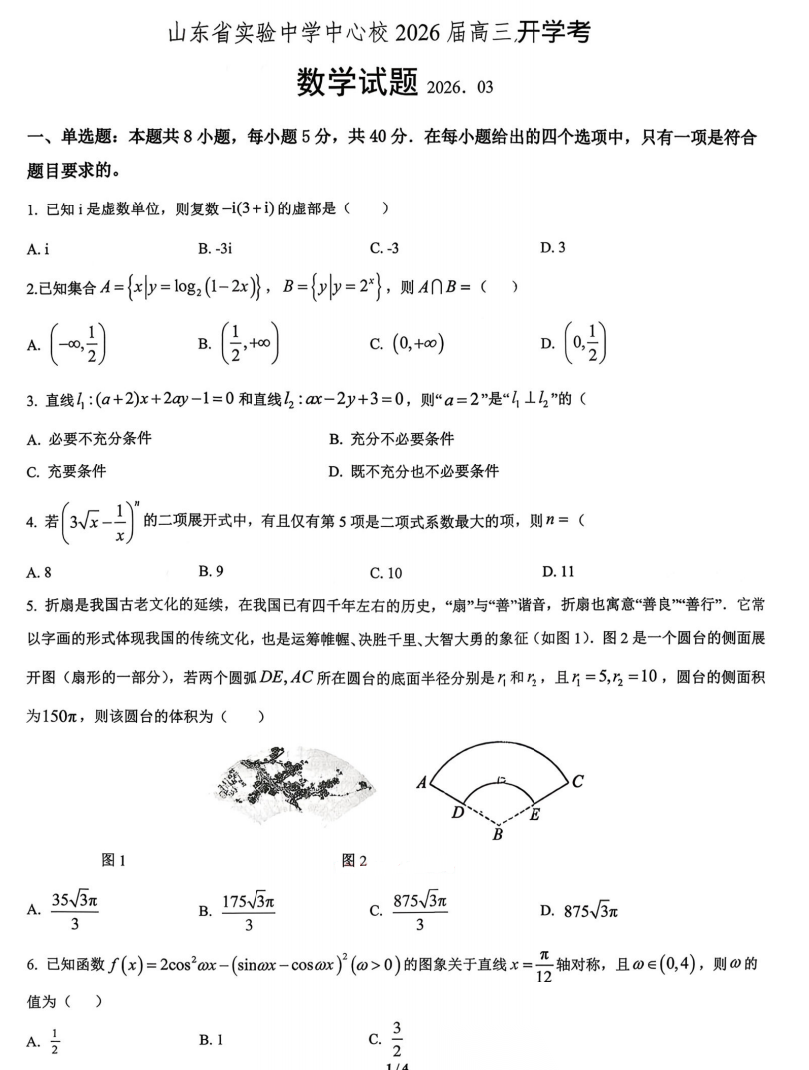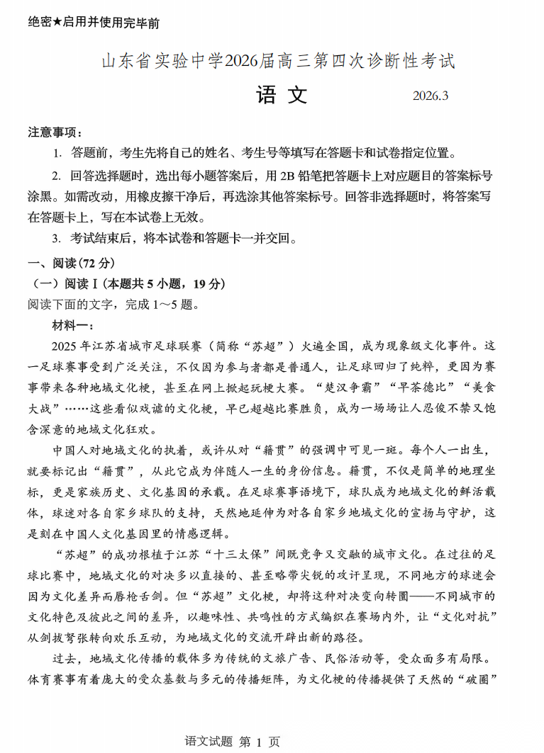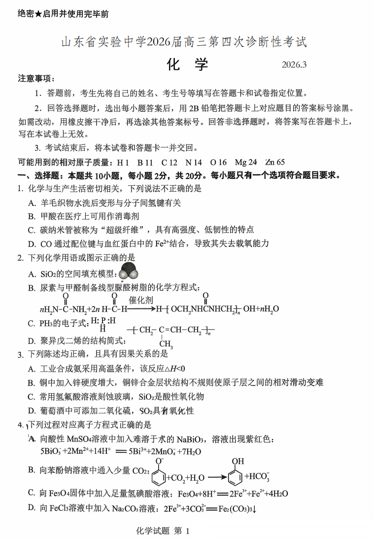 【Top25强校】【山东卷】山东省山东实验中学2026届高三3月第四次诊断性考试(省实验四诊)(3.11-3.12) 数学化学语文试题卷