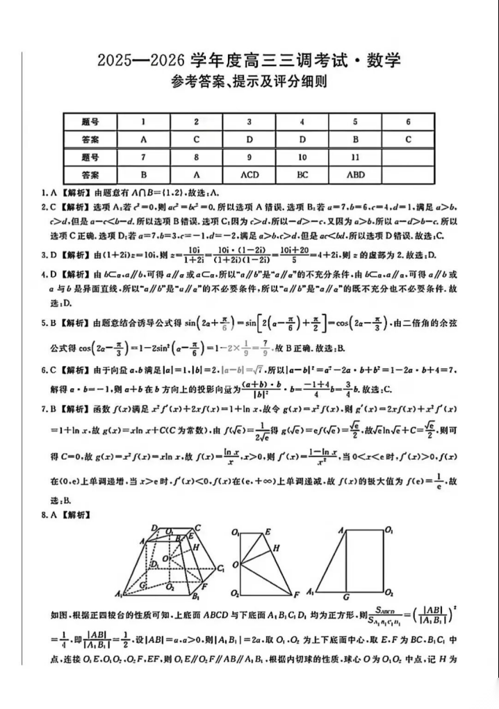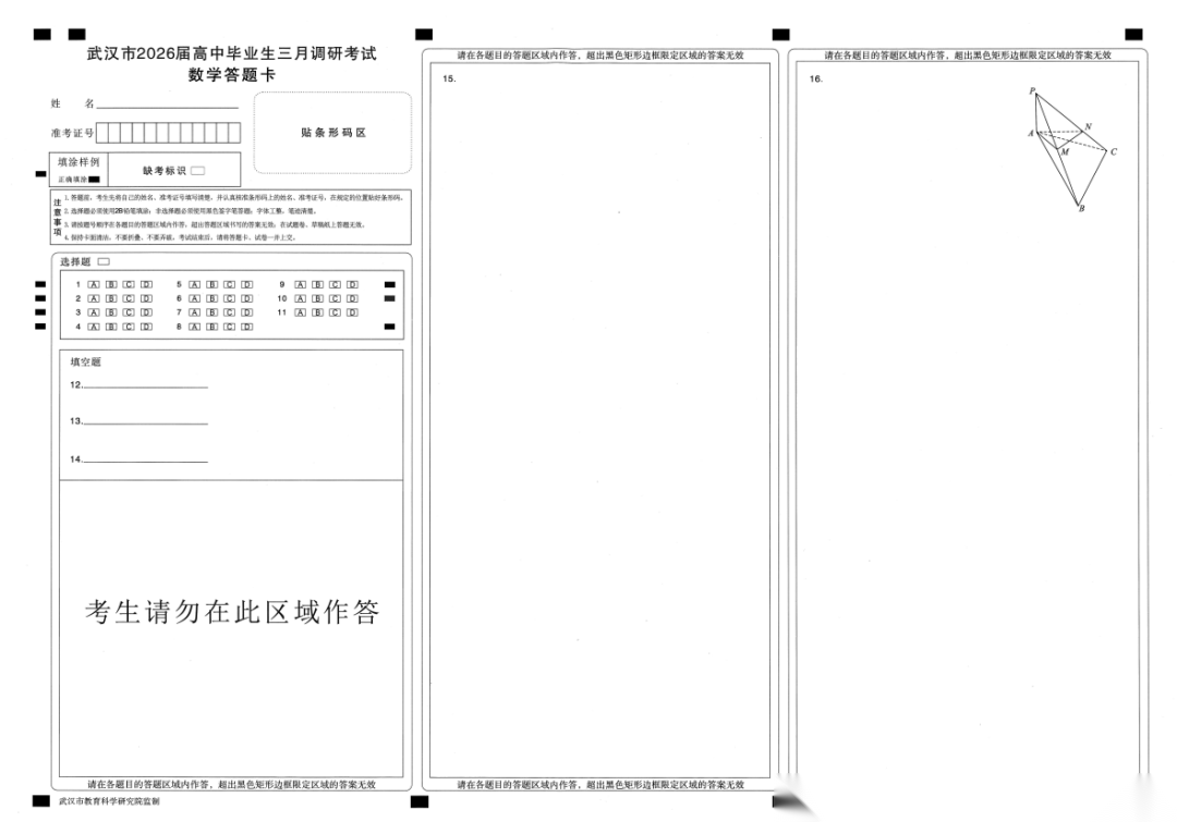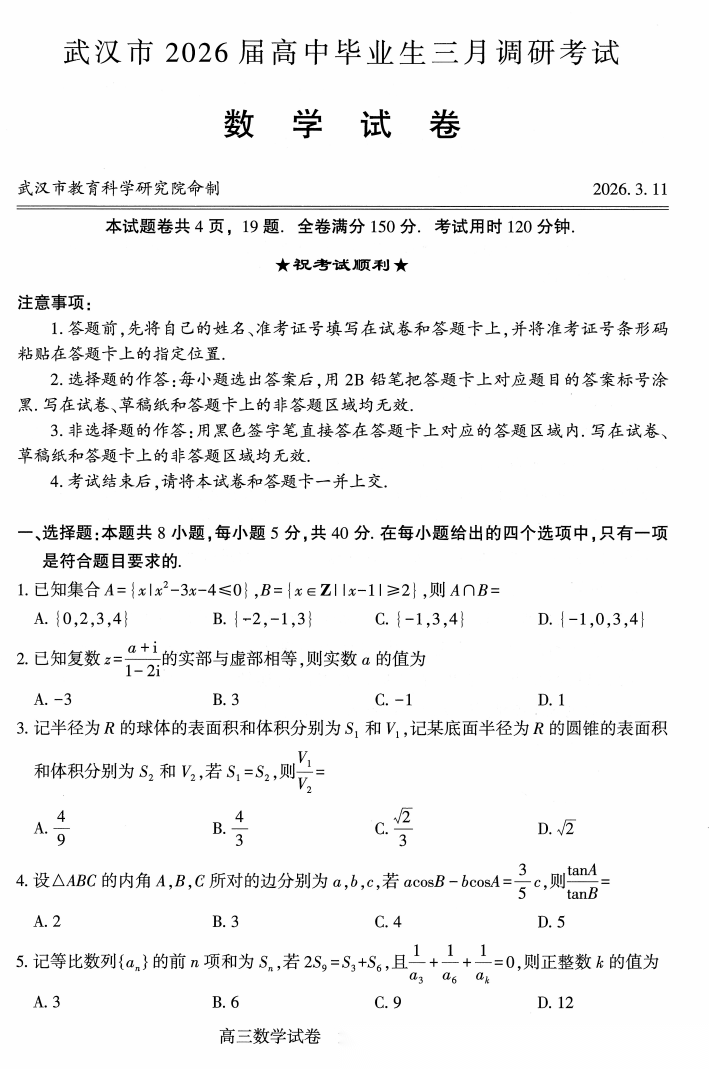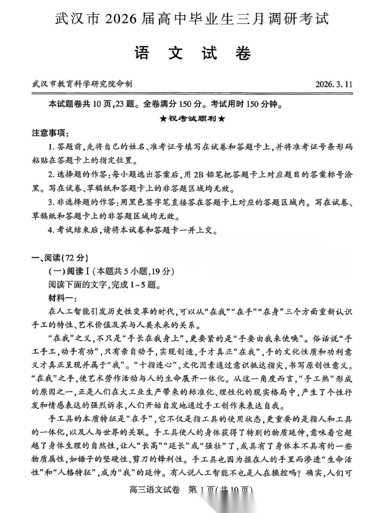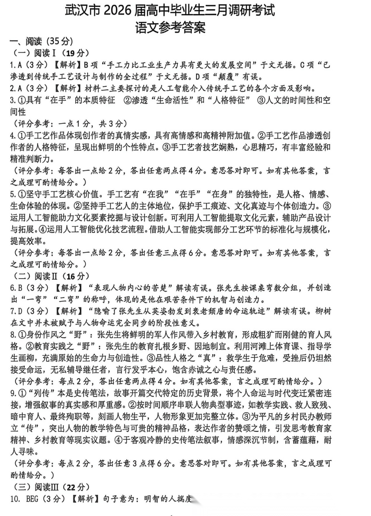 【湖北卷】湖北省武汉市2026届高中毕业生高三年级下学期三月调研考试(武汉三调)(3.11-3.13) 数学语文试题卷+答案