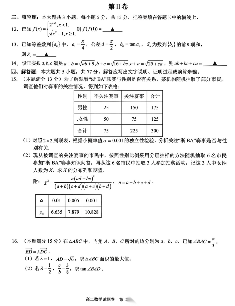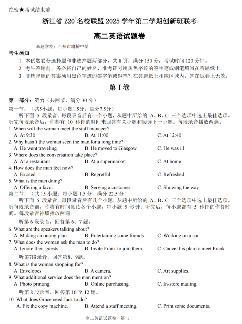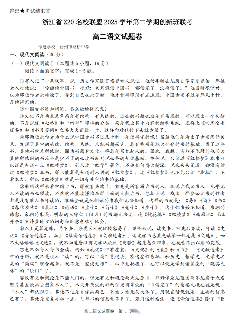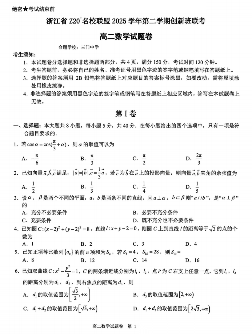 【浙江卷】【高二】浙江省Z20名校联盟2025-2026学年度高二年级创新班下学期返校联考(3.4-3.5) 理科全科试题卷(缺生物)+答案