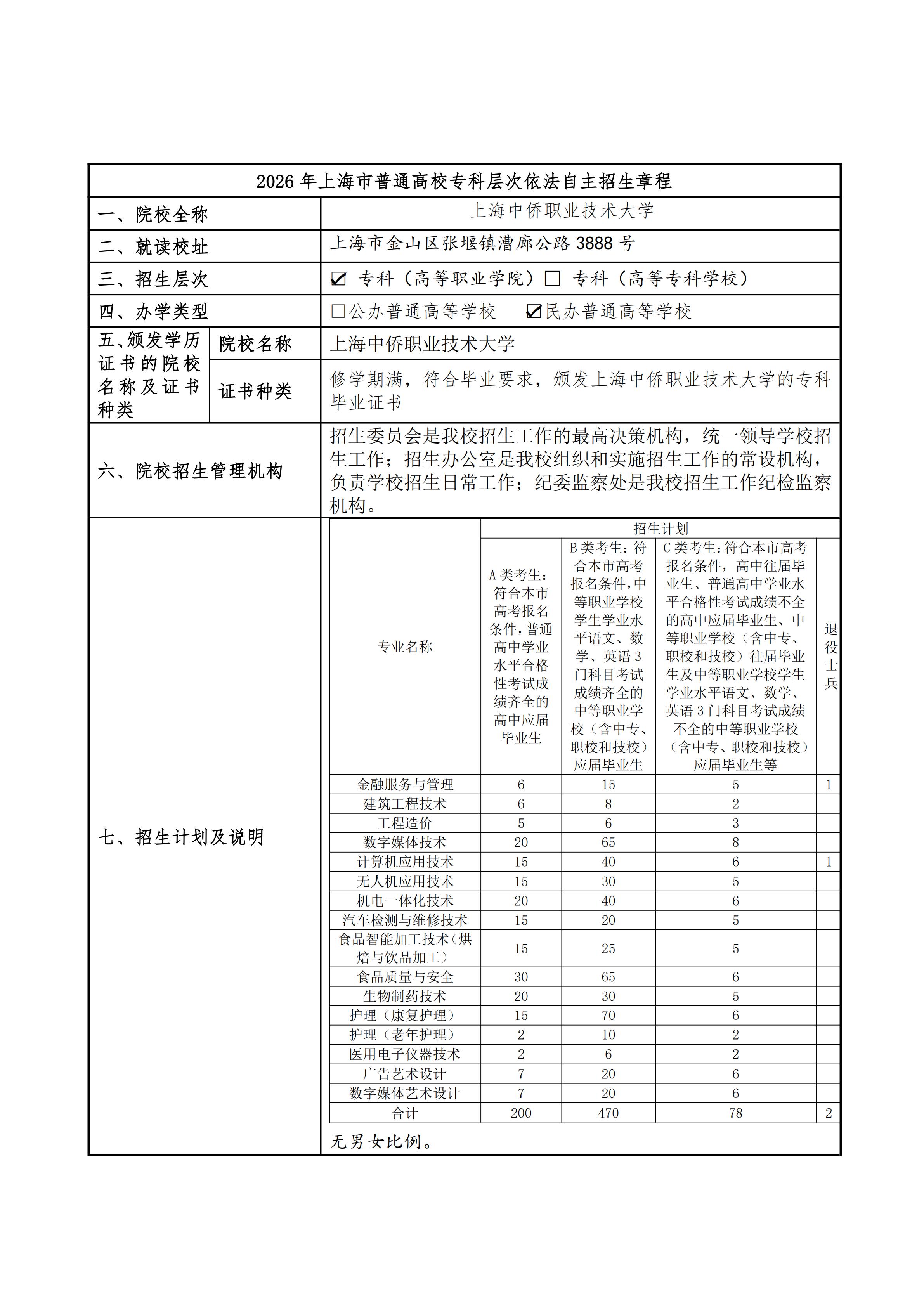 上海中侨职业技术大学2026年专科层次依法自主招生章程 2026-03-09 -