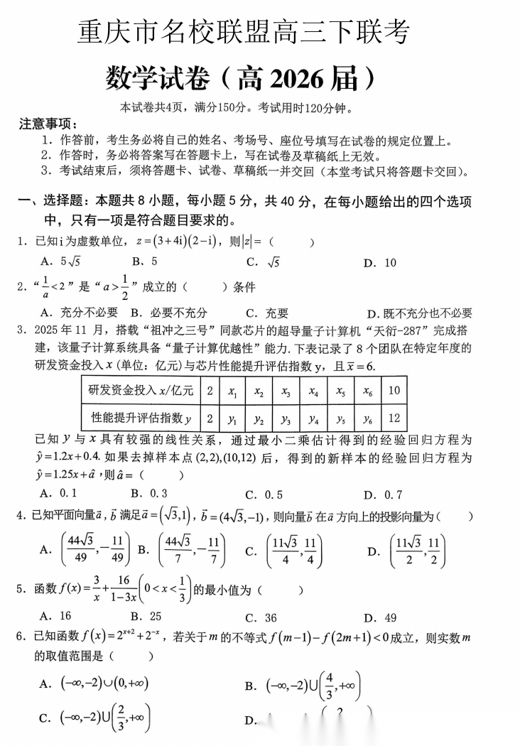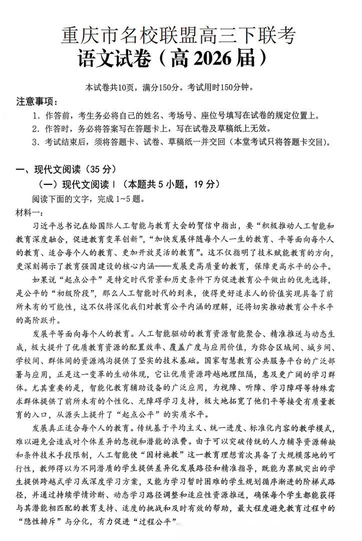 【重庆卷】重庆名校联盟(七校)2026届高三年级下学期第一次联考(3.11-3.12) 全科试卷(缺地政)+答案