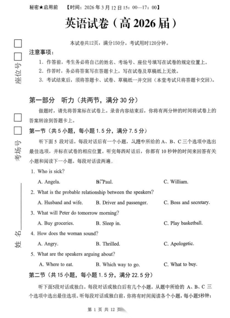 【超清无水印】:高三,2026年甘肃高三年级第一次模拟考试 【超清无水印】:高三,2026年甘肃高三年级第一次模拟考试