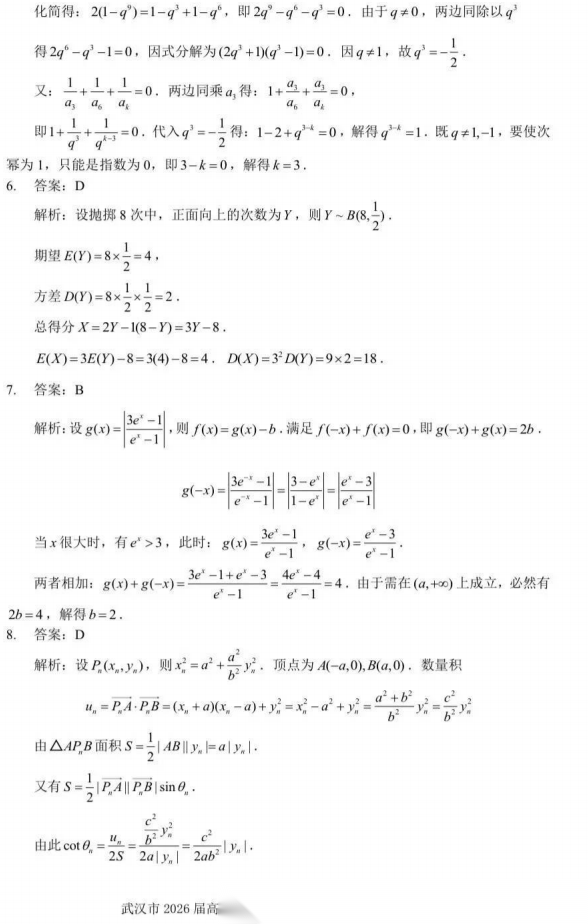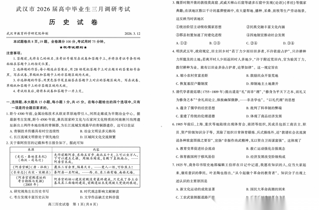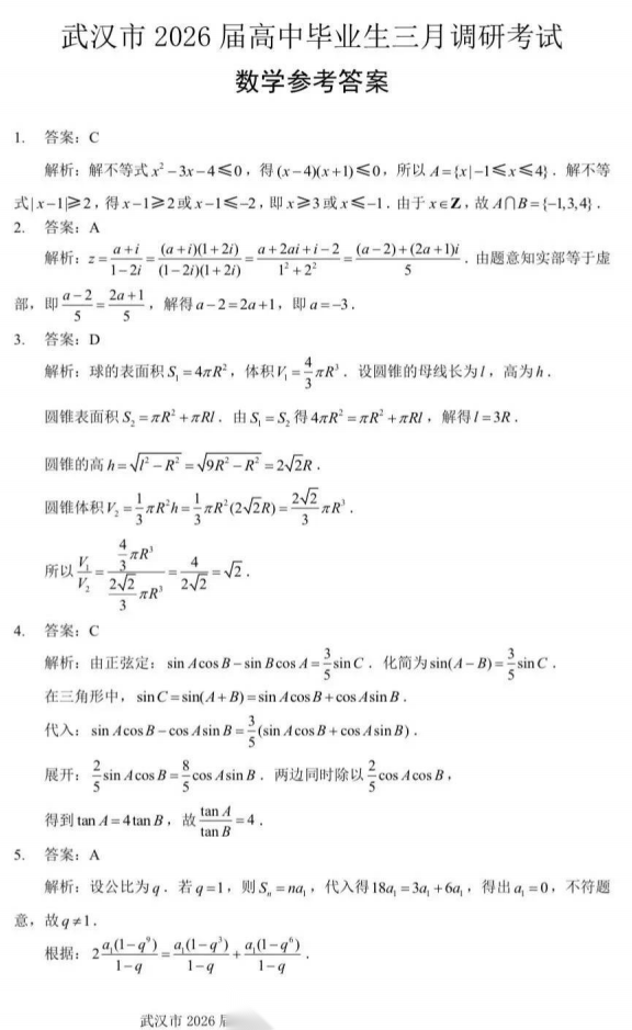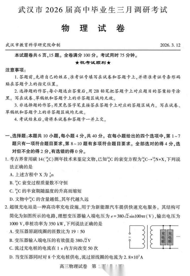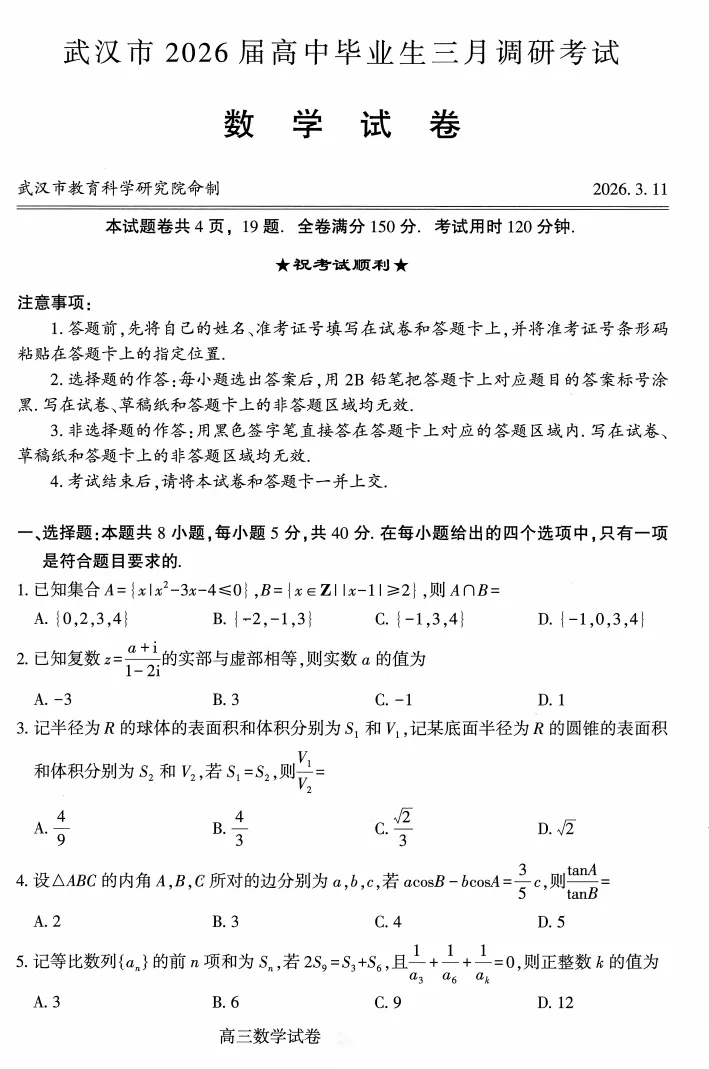 【湖北卷】湖北省武汉市2026届高中毕业生高三年级下学期三月调研考试(武汉三调)(3.11-3.13) 数学物理英语语文历史试题卷+答案