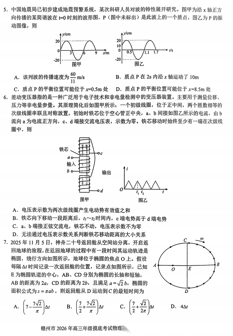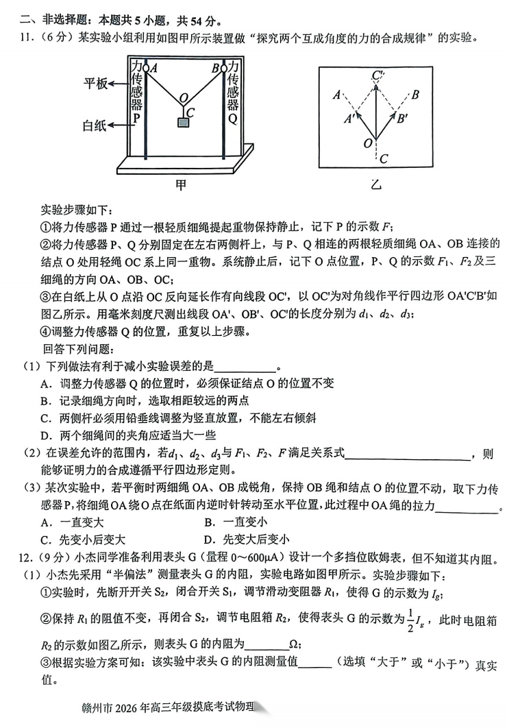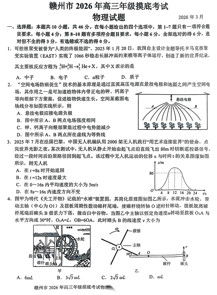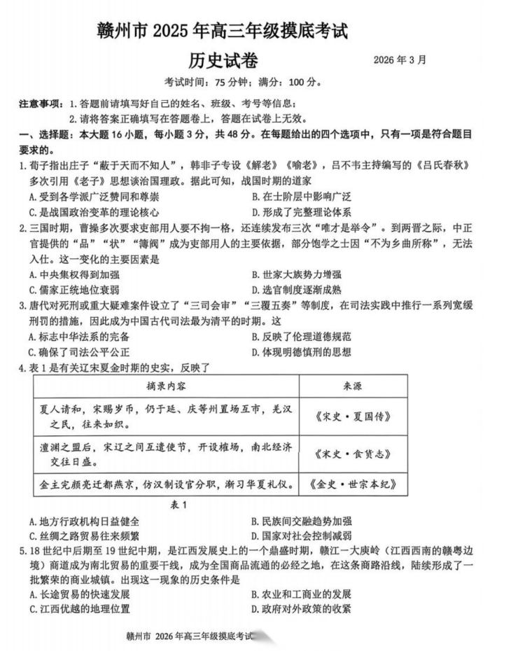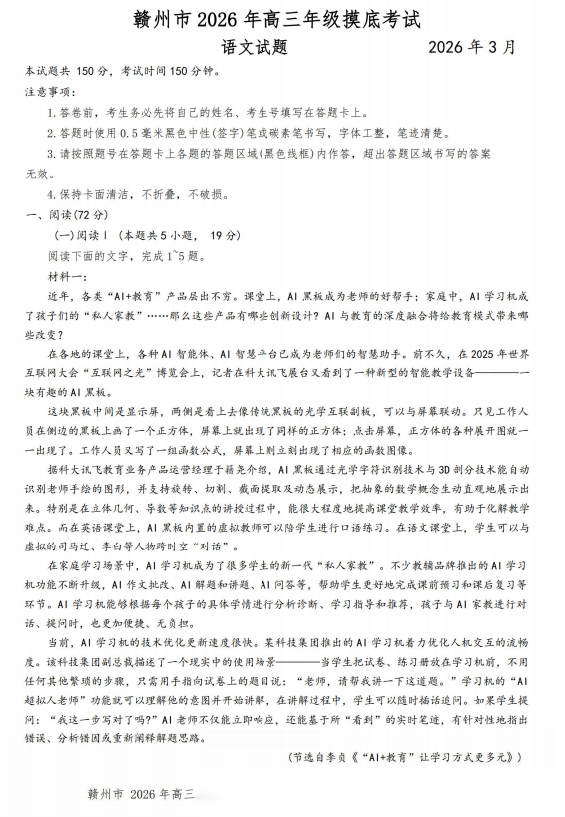 【江西卷】江西省赣州市2026年高三年级下学期摸底考试(赣州一模)(3.12-3.13) 数学物理语文历史试题卷+答案