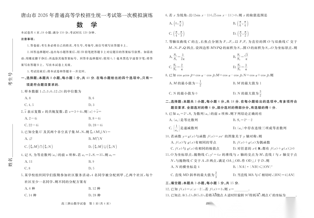 河北省唐山市2026届高三下学期3月第一次模拟演练