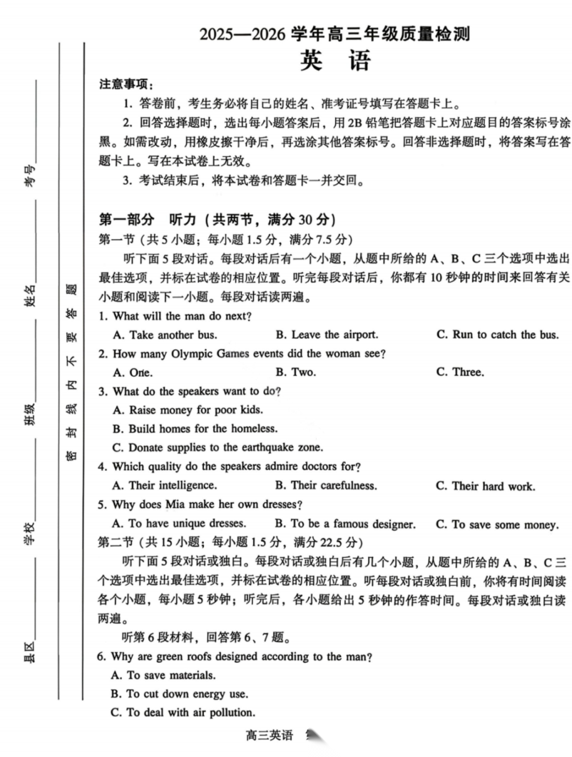 【超清无水印】:高三,福建省泉州市2026届高中毕业班模拟考试(一) 【超清无水印】:高三,福建省泉州市2026届高中毕业班模拟考试(一)