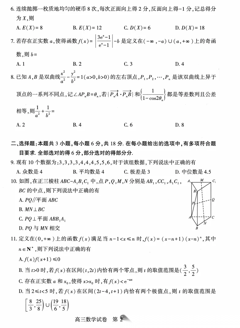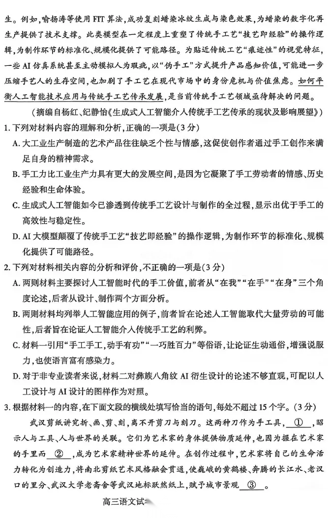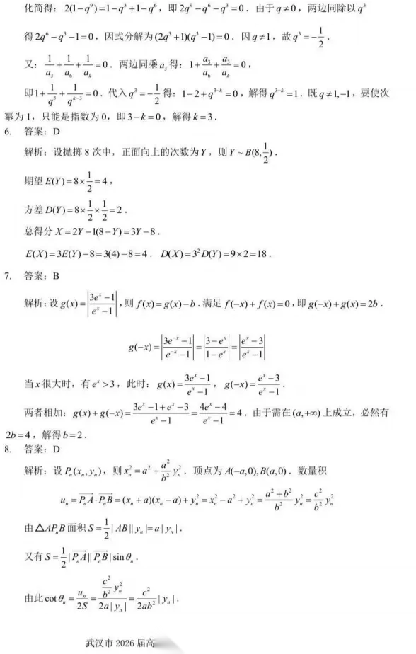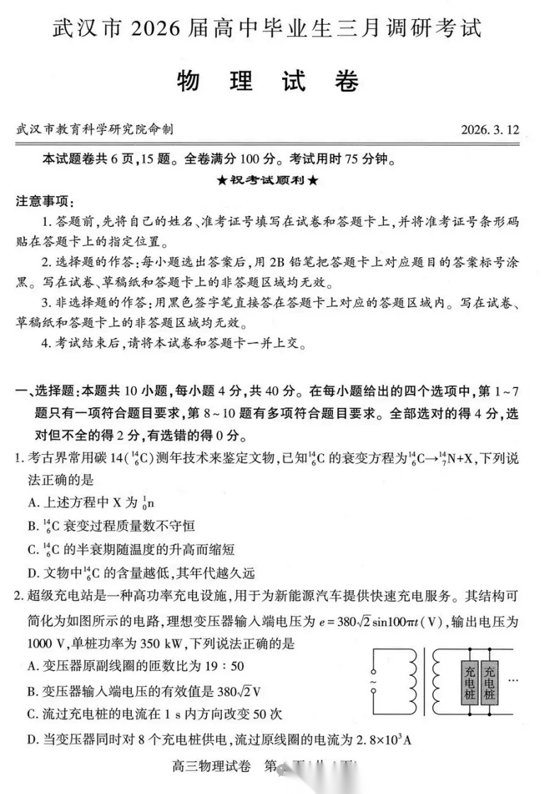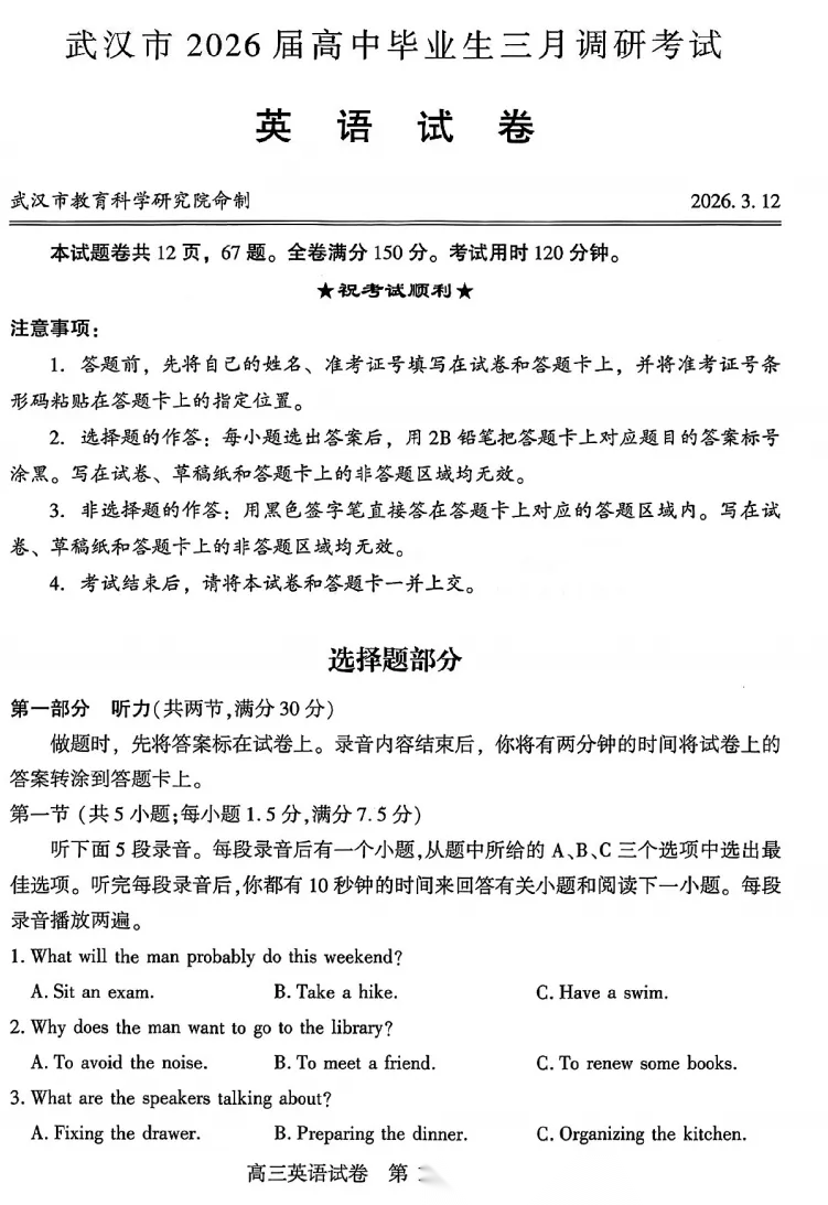 【湖北卷】湖北省武汉市2026届高中毕业生高三年级下学期三月调研考试(武汉三调)(3.11-3.13) 全科试题卷+答案