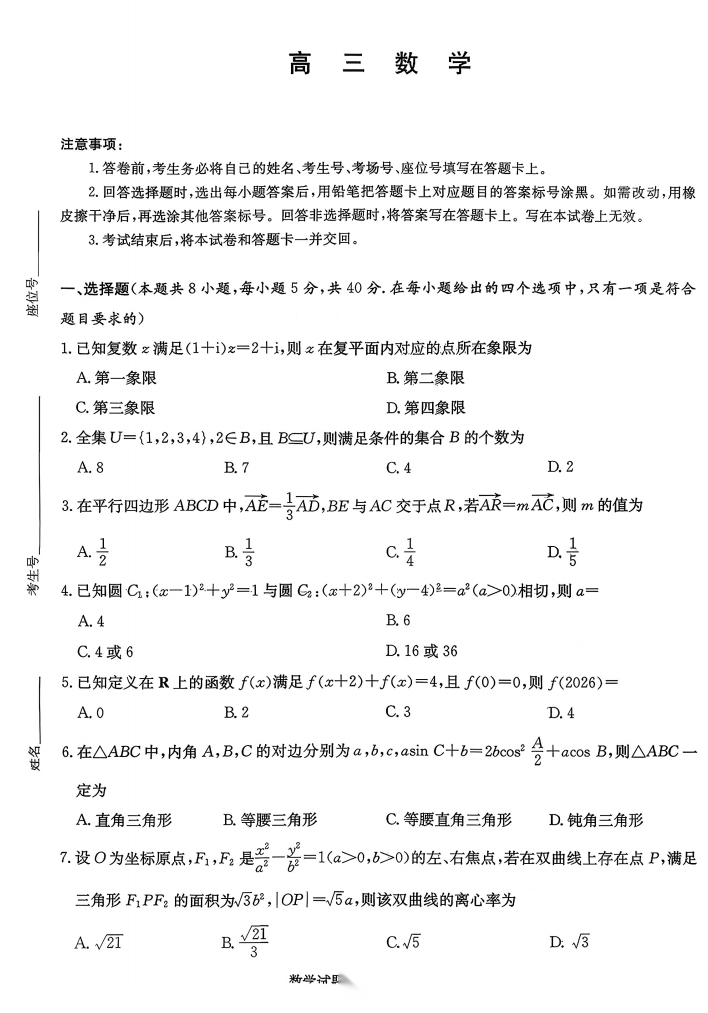 【超清无水印】:高三,福建省泉州市2026届高中毕业班模拟考试(一) 【超清无水印】:高三,福建省泉州市2026届高中毕业班模拟考试(一)