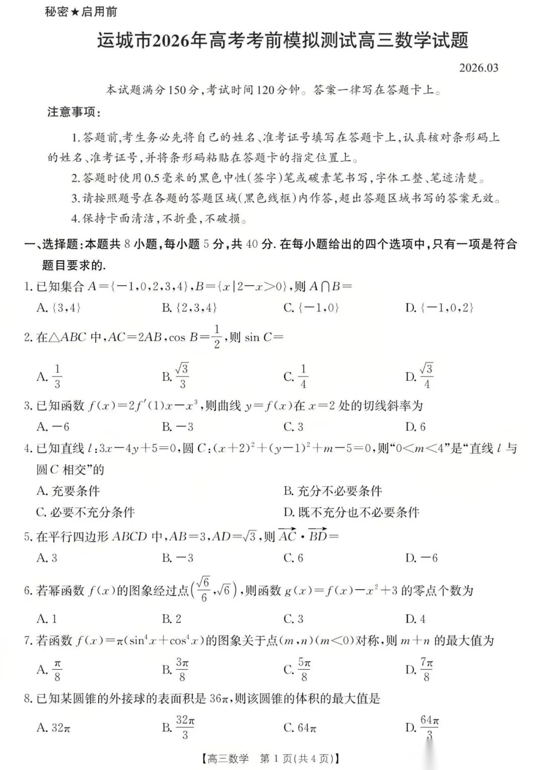 【全科】山西运城市2026届高考考前模拟测试(运城一模)