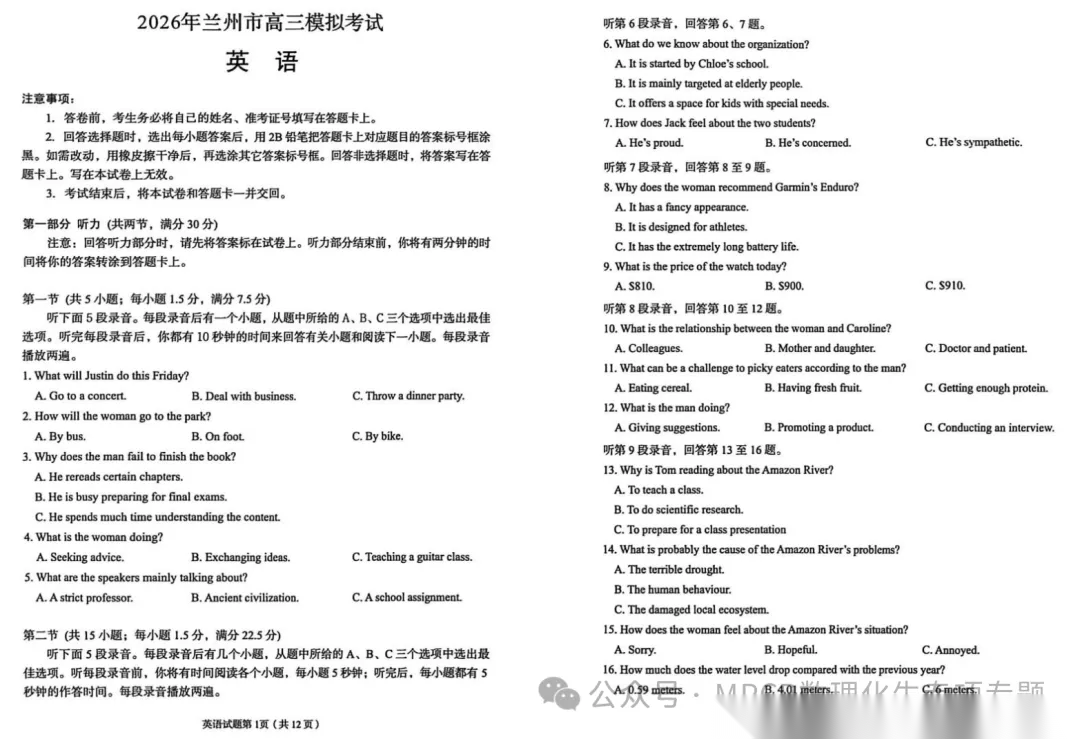 【补齐重发】【甘肃卷】甘肃省兰州市2026年兰州市高三3月模拟考试(兰州一诊)(3.11-3.13) 全科试题卷+答案