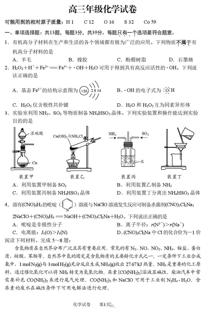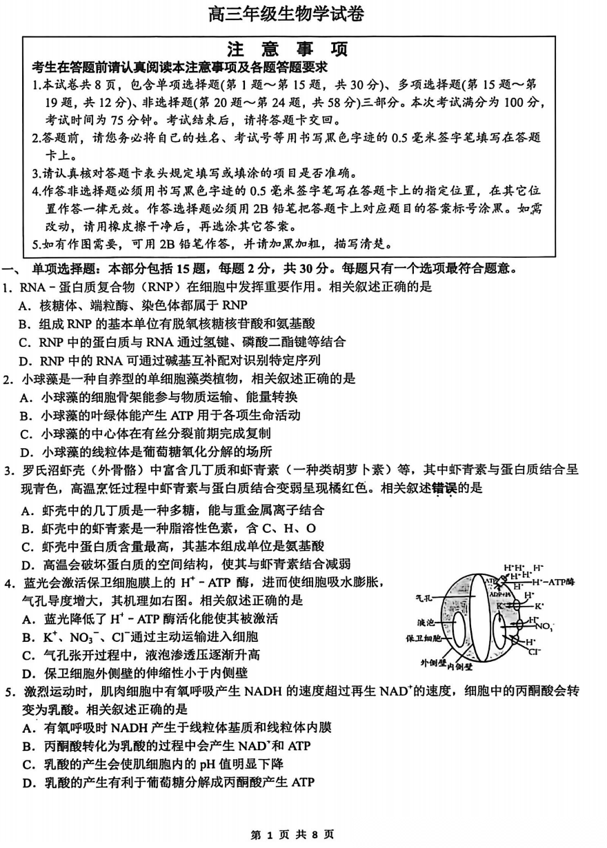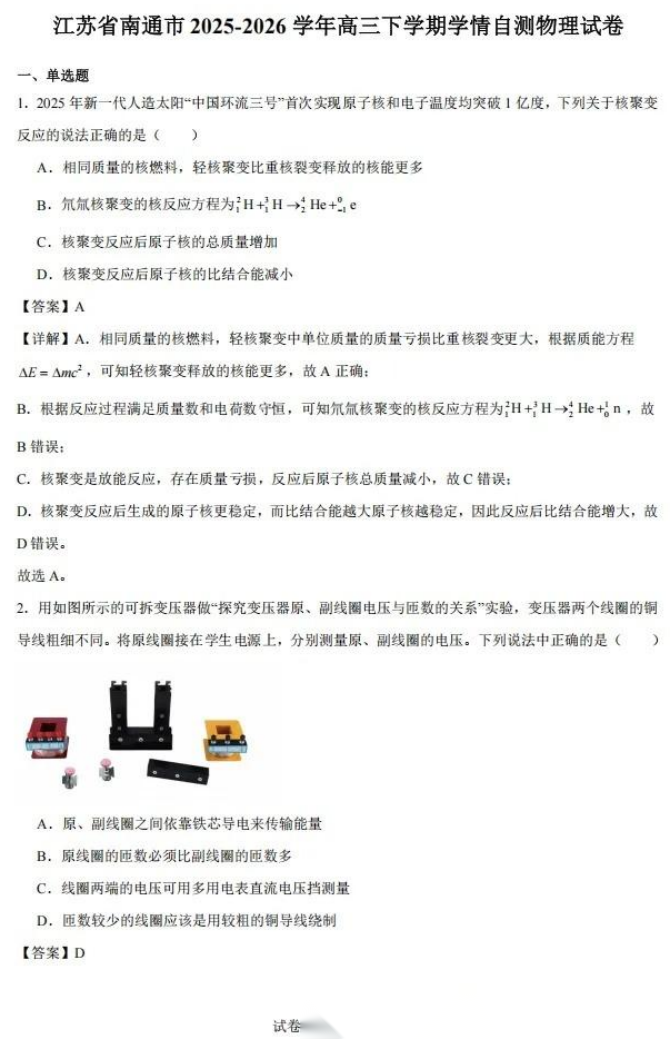 【江苏卷】江苏省南通市基地学校2026届高三年级下学期3月学情自测暨3月基地学校大联考(3.9-3.11) 理科全科试题卷+答案
