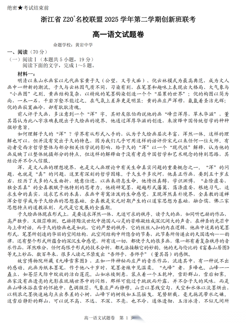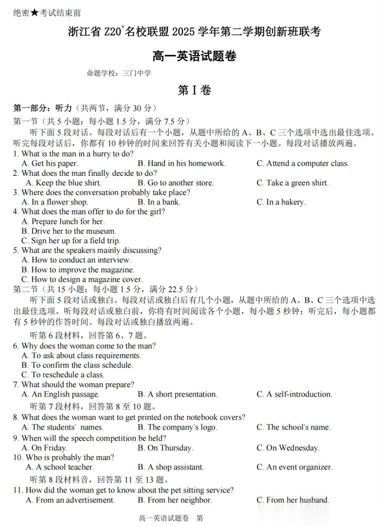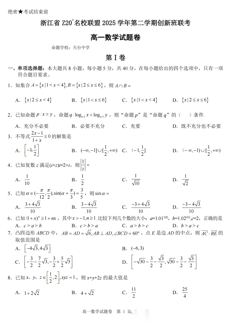 【浙江卷】【高一】浙江省Z20名校联盟2025-2026学年度高一年级创新班下学期返校联考(3.4-3.5) 理科全科试题卷(缺生物)+答案